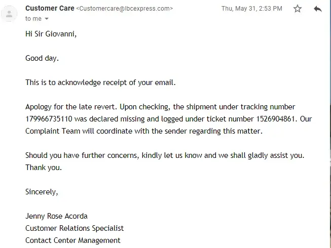 The delivery of the parcels (2 boxes) from New York USA to Mabalacat City Pampanga was incomplete. The tracking number was [protected]. I tracked it on your site and it says that its already in the LBC sea cargo warehouse at Manila since August 8, 2018. 6pm. I received the first box with tracking number [protected], the delivery staff just said that it was forgotten. How was that possible? We need to claim that parcel as soon as possible. We already acknowledged the fact that the weather lately was bad that may cause delays with delivery. But the reason of the delay of the parcel that we should have had received few days ago was negligence of the staff handling the sorting and delivery. I look highly and patronizing your company until this happened.