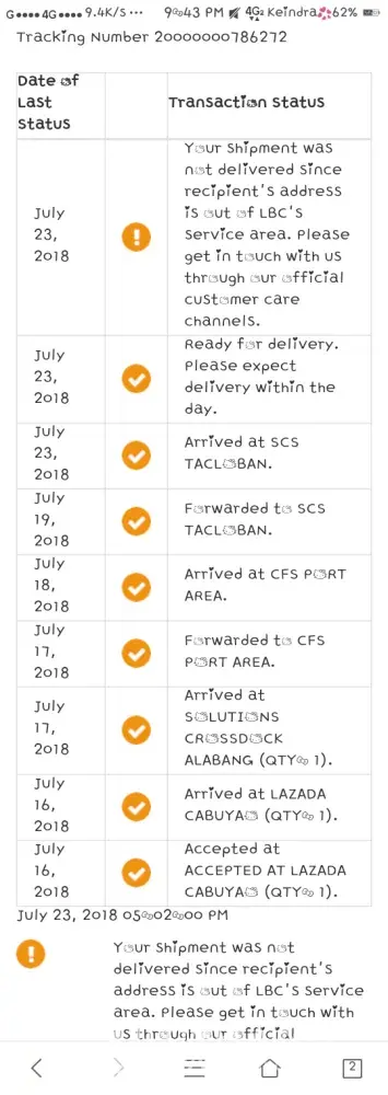 Ang tagal ko nagantay para sa commode chair na inorder ko overseas noong july 19, 2018. july 28, nabasa ko ang notification ko na nadeliver na daw ng july 27 pero wala namang nagtungo sa amin. Agad akong nagtungo sa LBC na tenant din dito sa mall kung saan tenant din kami upoang magtanong kung ano ang dapat gawin dahil ang sabi ng staff ng LBC dito sa Ayala MAll ". hindi nadeliver dahil mali daw ang address". Tumawag ako agad sa customer service para ipaalam na walng mali sa address at kailangang maideliver ang aking order. Nakasulat din sa notification na.."We tried to deliver your package, but could not reach you." eh wala nga ako nareceive na tawag o text na darating ung shipment ko. HINDI NILA AKO KINONTAK.
