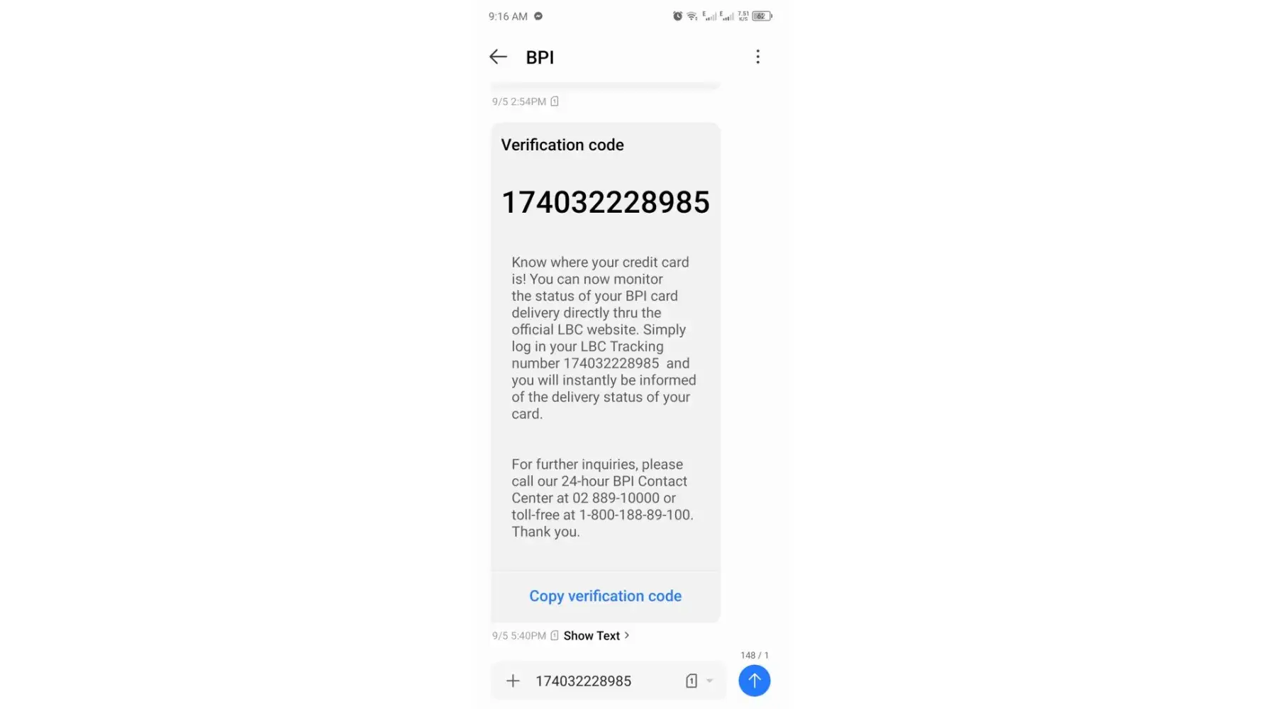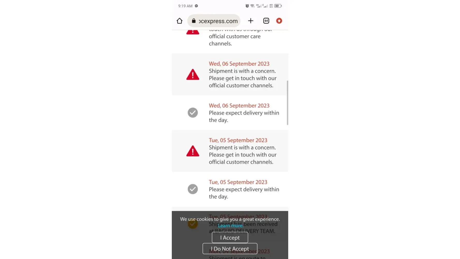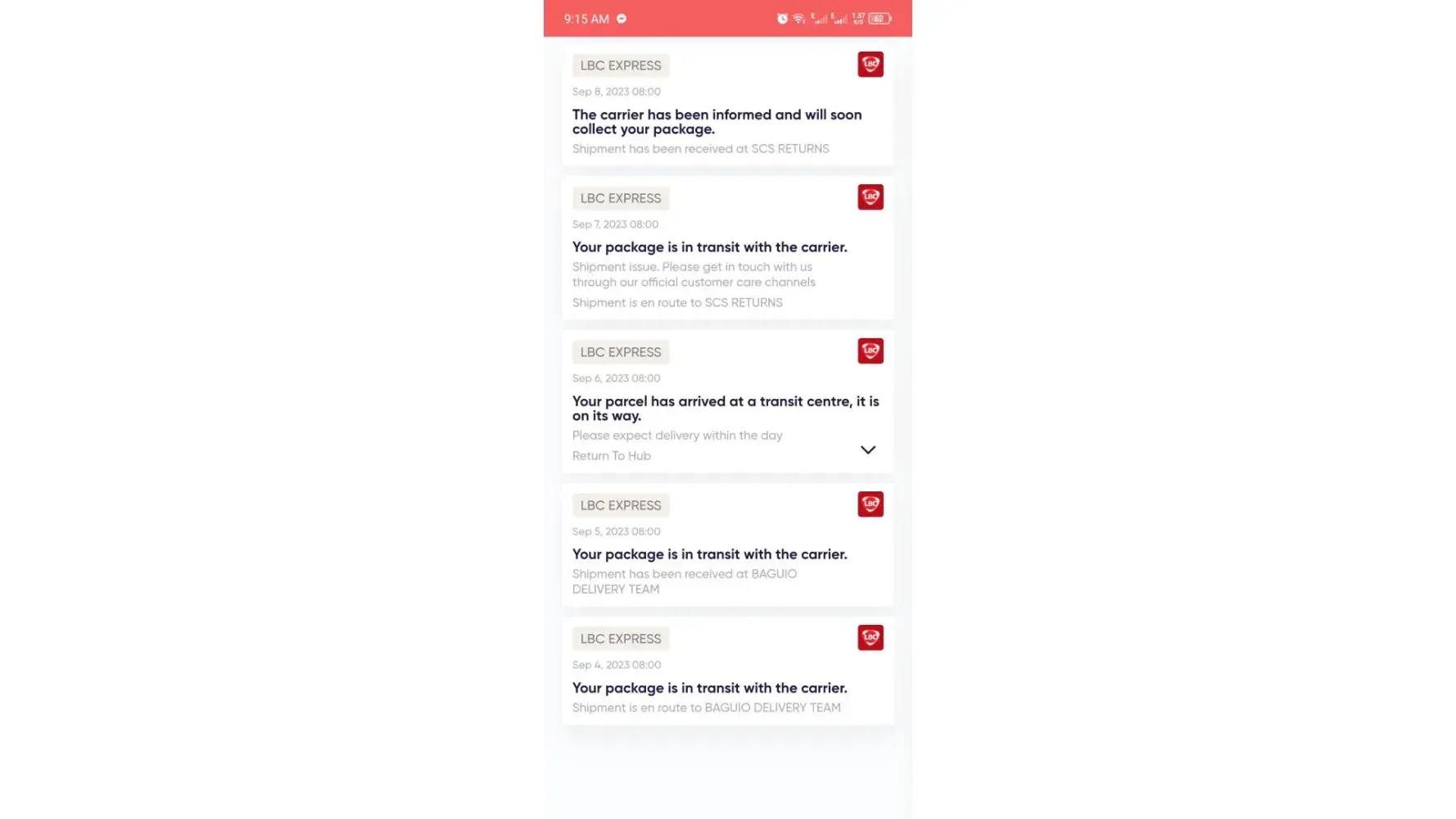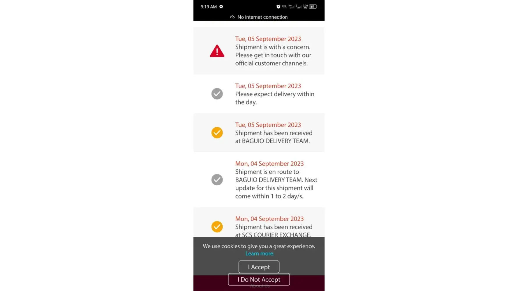September 05 of 10:20 am it was in Baguio Delivery Team as I track my credit card for me to know where it is, also within that day 12:17pm to be specific, it was out for delivery, but then 16:43 it says that shipment is with concern, and 17:35 return to hub. I was expecting a call or text but it didn't happened so I waited again because it was just the first day of delivery.