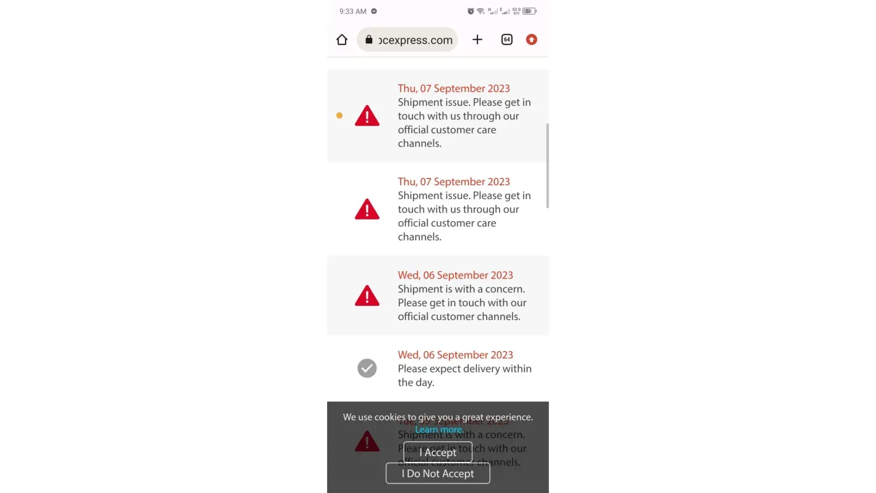 The following day September 6, 12:58 it says that it is out for delivery, but again no call or text and again it was return to hub by 19:47. I felt uneasy, because what could be the problem, no information given to me by call or text, no contact reach out to me.