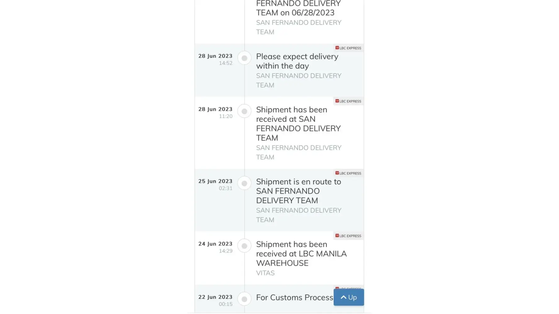 Hello. I would just like to follow up my parcel.. lbc track says it has been on san fernando delivery team since may 20.. may 26 and no update.. "expect delivery within the day".. I need the item..