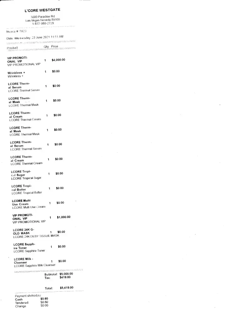 I was pressured into purchasing 5K worth of products in a matter of 30 minutes. I have a mental disability and could not handle aggressive Sales person. I am not allowed a refund or return unopened product. I am distressed and do not want this to happen to anybody else that cannot stand up for themselves. Owner Alex Giovanni, L'core Westgate hotel and resort Las Vegas Nevada. this happened to me at the Westgate Resort on