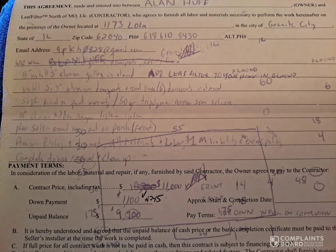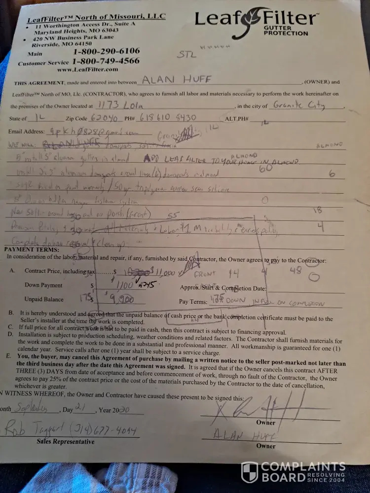 Leaf Filter North of Missouri, LLC. 11 Worthington Acess Drive SuiteA Maryland Heights MO. 63043. Leaf Filter Gutter System. Job Work Order STL 17003. Main issue of complaint is an over charge of $1,600. On contract price was $10,300. Minus down payment of $1, 100 / minus tear off and clean up by us was to be credited $800.00. On contract added on $800.00 not subtracted credit for tear off and clean up. We also had 100 roof ends in origional paper work. No rafts ends were replaced, should have received some credit back for this detail. Therefore, feel $1, 600 back from issue mentioned above plus $400.00 on no rafter ends used. Total credit should be $2, 000. The gutters were leaking behind fascia boards after first rain. Husband spent three weeks a few hours after his work everyday finishing the job the contractor did not do to prevent water leakage behind boards. Added costs on supplies to fix their issues. Bottom Line is we feel $11, 000 was an over charge for a non professional workmanship and no precision pitching on the guttering job. The gutters were placed two inches too low in several spots causing the water behind fascia board issue. The workers took down lights in back and top of window trims (8)never put back up. Total owed us should be $2,000.