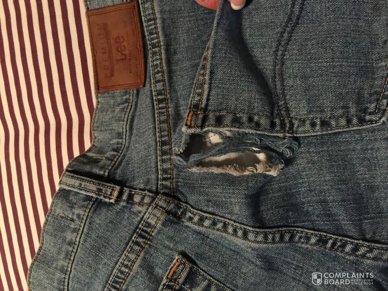 I've worn LEE JEANS, for as long as I started buying my own clothes-which was a VERY LONG TIME AGO. Two pair I bought, from Wal-Mart, ripped out, right next to the back pocket. It's like the material was rotted. I wrote to them, twice, to complain, never heard a word back. Guess it's time to change to another brand, and be their loyal customer. I should have taken them back to the store, but I hadn't saved the receipts. Wasted money...