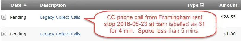 When the system asked for my CC info, it called itself by some 3-letter acronym like PTN services or similar. Nothing about "Legacy Collect Calls" nor was there any mention that the charges were any different than printed on the phone. There was no mention of charge rates at all!