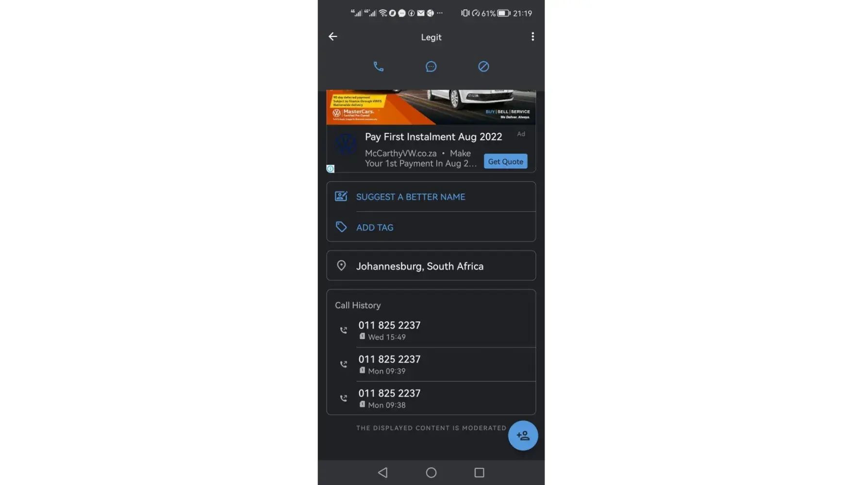 Legit.co.za phone numbersClick up if you have successfully reached Legit.co.za by calling +27 319 420 444 phone number 28 28 users reported that they have successfully reached Legit.co.za by calling +27 319 420 444 phone number Click down if you have unsuccessfully reached Legit.co.za by calling +27 319 420 444 phone number 21 21 users reported that they have UNsuccessfully reached Legit.co.za by calling +27 319 420 444 phone number
