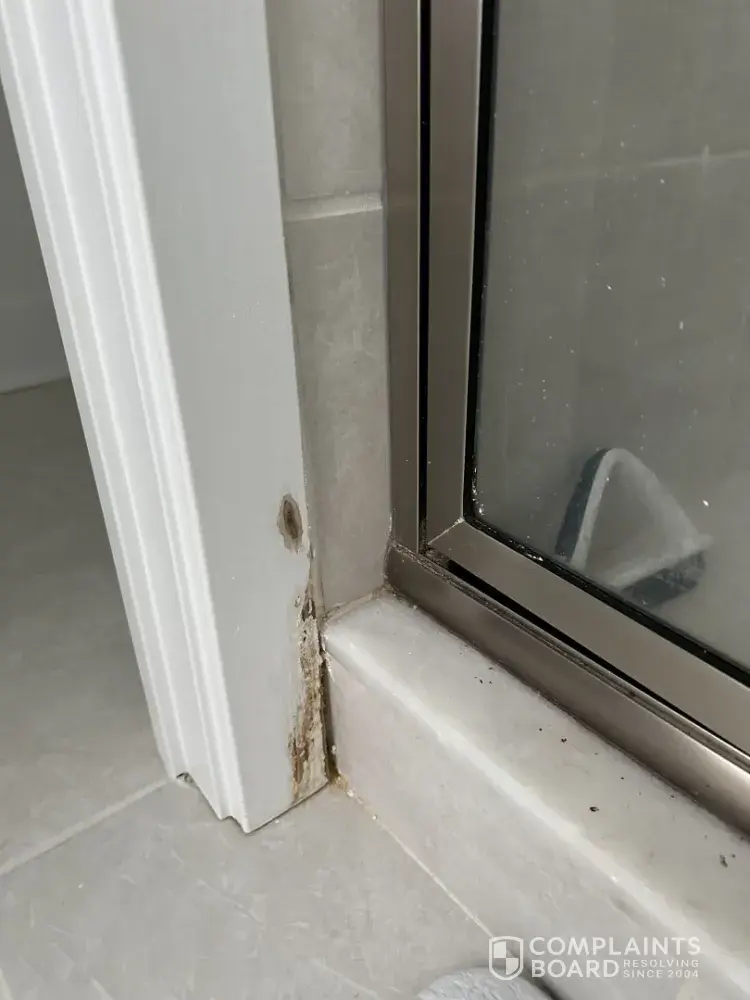 Water leak in the shower, causing wood rot and possible mold on the outside of the shower on both sides. Dry wall is damaged as well as the molding. The shower was never completely finished and left with holes in the grout. Unfinished bench underneath.