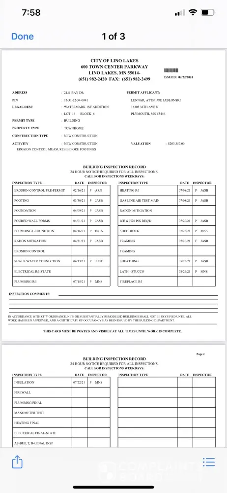 I got a file from the city of Lino lakes on 9/14 starting that our framing inspection failed. This was never fixed. Is this going to be fixed and inspected before we move in? This deeply concerns me because this is going to affect the resale of our house in the future.