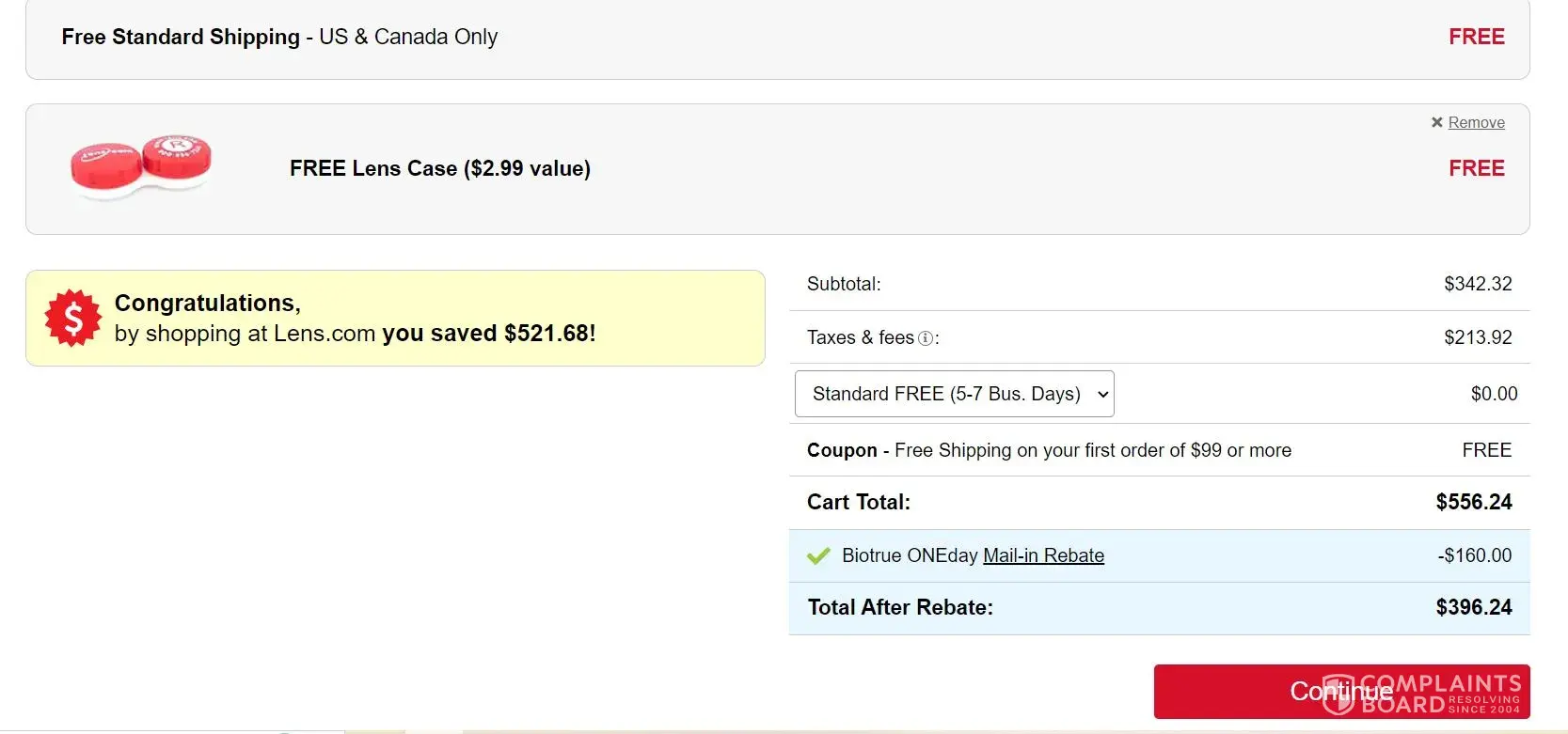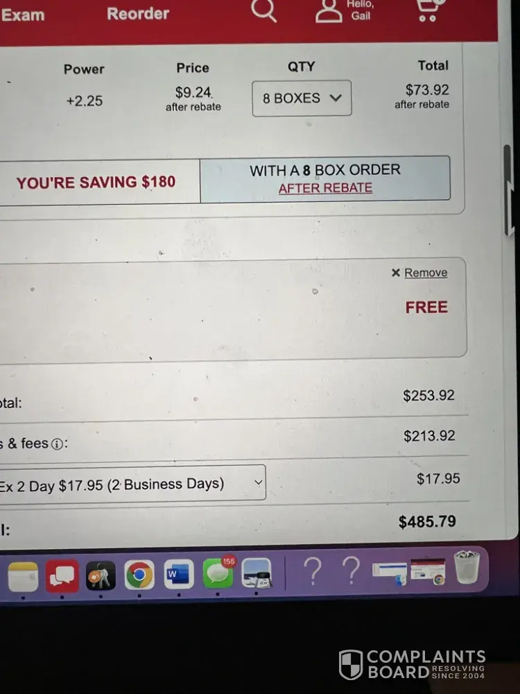 Customer since 2014, but noticed a huge disparity in cost when initiating my most recent order. Without a rebate, they show $72.24 per 90-lens box of 1-day lenses. Buy 8 boxes and the price (after rebate) is shown as $35.99 and rebate as $290. Great. The next screen in the checkout asks you to confirm where you want the boxes sent with a 'continue' button below it. When you accidentally scroll below that, you see a blowout of the order, with a whopping $241.92 in taxes and fees that "are compensation for servicing your order". That's the only place they show the added taxes/fees. If you click 'continue' and approve where to send the boxes, you miss that, because the final checkout screen never shows that added charge in its summary of your order. ... This is deceptive. Reporting this to my state's attorney general He's very responsive to consumer stuff like this. ... Even the rebate is designed with multiple failure points: Instead of just offering an instant rebate at the point of sale, they introduce things that will prevent some customers from getting their rebate money. You have to download and print out a form; you have to submit the form by a deadline; you have to send in proof of purchase panels from the boxes (never mind that lens.com already has proof that you have the boxes); you then have to wait for your rebate card; when your rebate card arrives, it has an expiration date on its usage. And now, they've delayed sending out rebate cards by, in my case, more than 6 months, because of "supply chain issues" due to the pandemic. It's all BS, just a method for them to keep millions in customer dollars in their corporate bank accounts to invest and capture $$$ in interest instead of simply returning it to you promptly or immediately at the point of sale. ... I tried to remove my credit card from my account, but they don't even let you do that. You have to contact customer service, where you're told the only way to remove your credit card info is to have them cancel your account. Which I did. These practices are deceptive at a minimum, perhaps illegal if tested by a state attorney general.