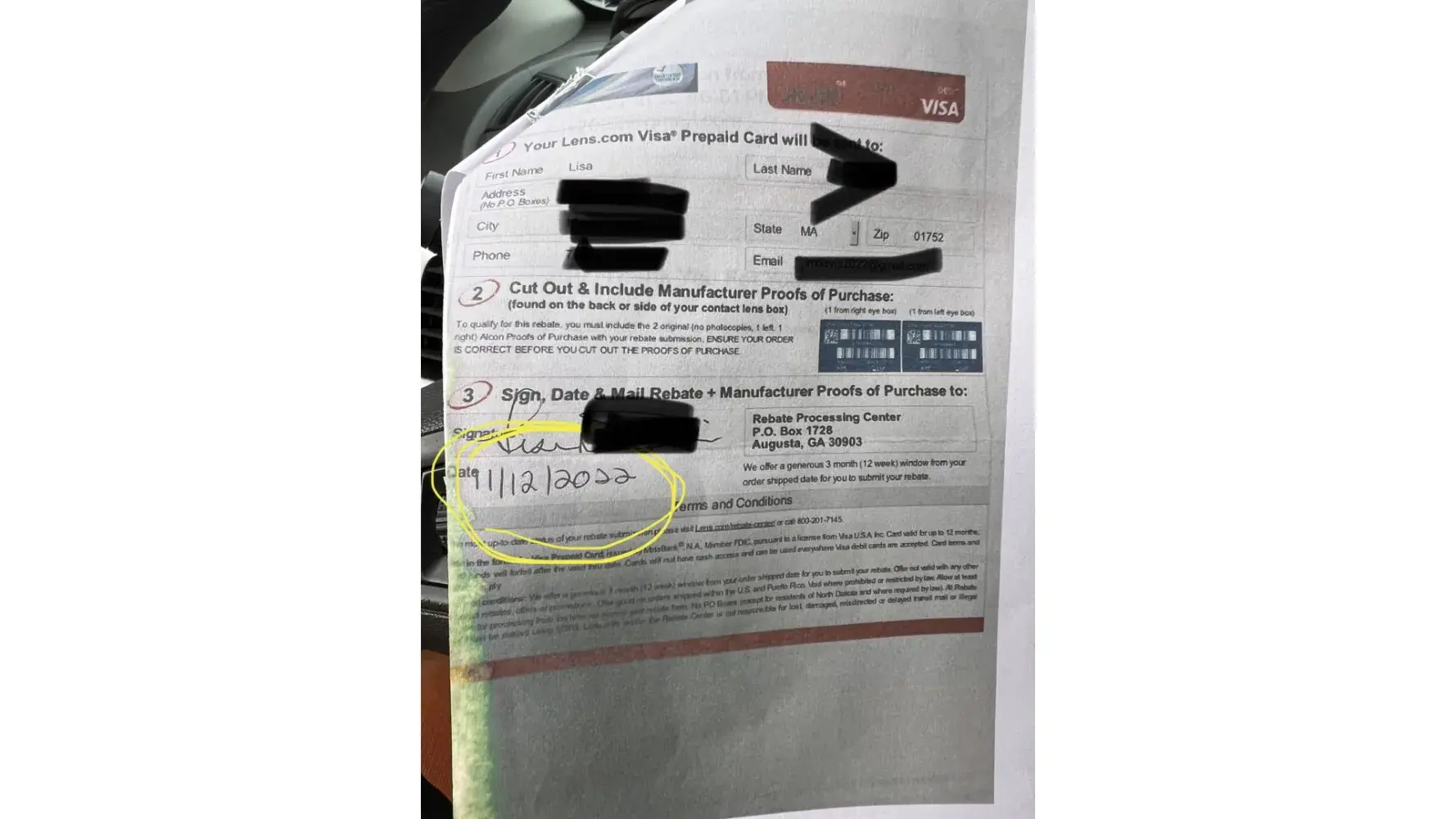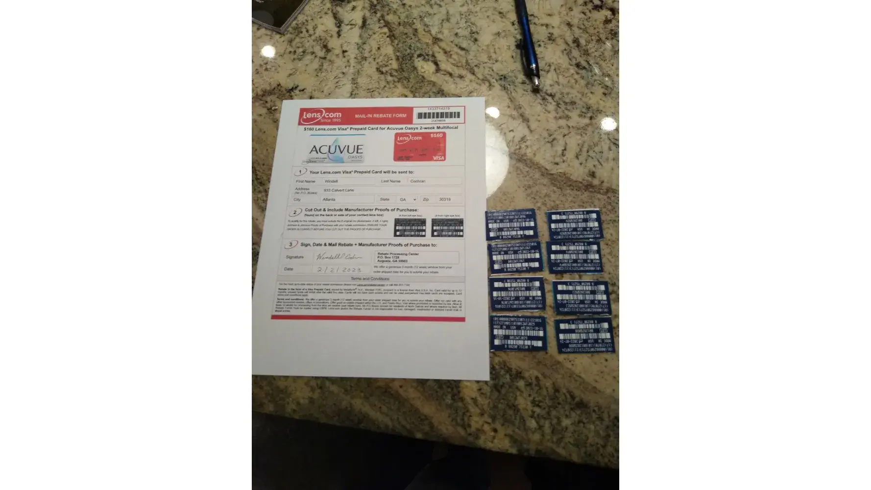 After printing off the rebate form and completing it with information that Lens.com already have. I then had to cut off codes from all eight boxes and attach to form. This took almost an hour to complete per their instructions. I then took pictures of everything since I was mailing all my proof of purchase back to a generic processing center. After many months of waiting I check only to find out they claim they never got the information. I spoke to representative who said they cannot do anything since my 90 days to file a claim had lapsed. I was told that it was probably "lost in the mail" I doubled the postage to ensure it would get there. The entire process is poor and sets each customer up for failure. All information need for the mfg rebate Lens.com already has without the customer having to send it all back in.