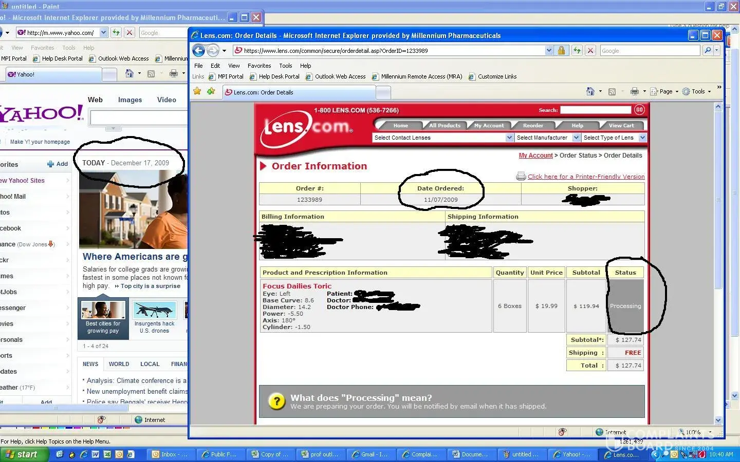 I implore anyone who wants reliable service and a online provider of contact lens that they can count on to NOT GO WITH LENS.COM unless you want to be treated like dirt, ignored, and not even compensated in any reasonable fair way by the rape of what they call customer service. I ordered lenses on 11/7/2009, it is now 12/17/2009 and it still shows as processing. Their website says it should take a maximum of 10 days to get lenses from the manufacturer after which they will ship to you, this should take no longer then 15 days at the MAXIMUM, for you to get your lenses in the mail after you place the order online.