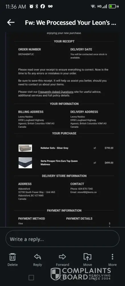 NO one bothered to respond so we sent this second email From: John MacAusland Date: June 16, 2023 at 10:08:50 AM ADT To: Customer Care , [protected]@leons.ca, Leann Frizzell , Front Office , Shakira Simmons