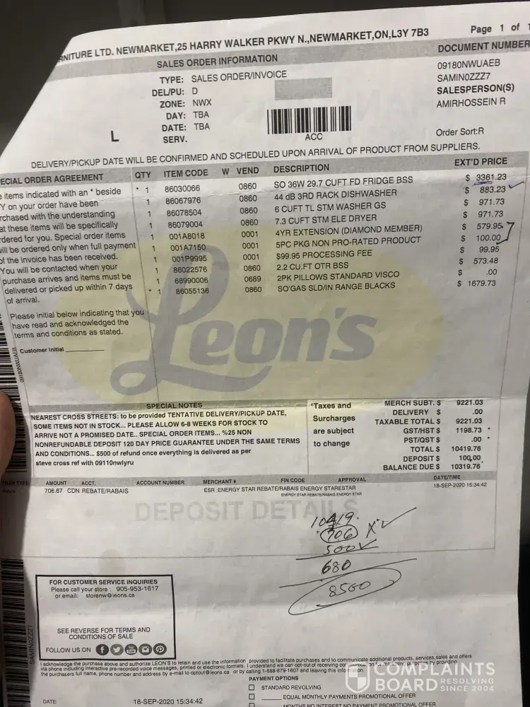 I have placed an order of 20K + items in November of 2020 from Leon's store at 535 Steeles Ave E. It has been a struggle in getting confirmation whether one of the item Refrigerator will be delivered on time.