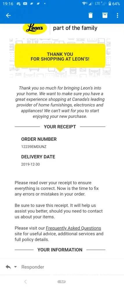 So, surprisingly enough, on Wednesday, February 5th at 11:47am, I received yet another email to confirm my recliner would be delivered on Thursday, February 6th from their Leon's store in Anjou. I was ecstatic…I figured they finally found a way to get my recliner delivered!