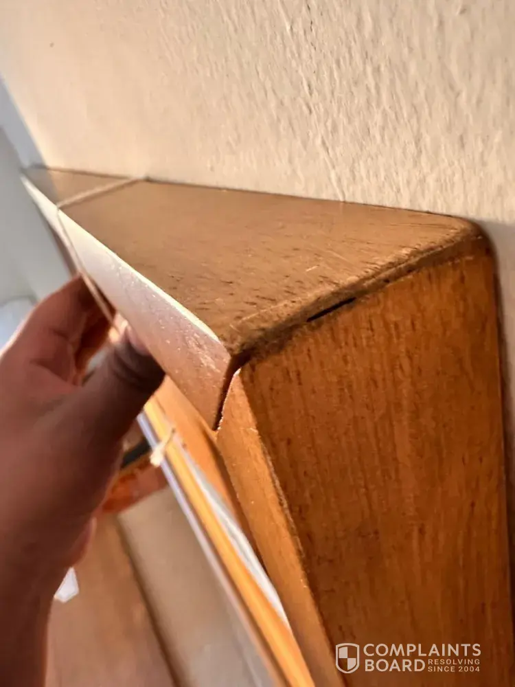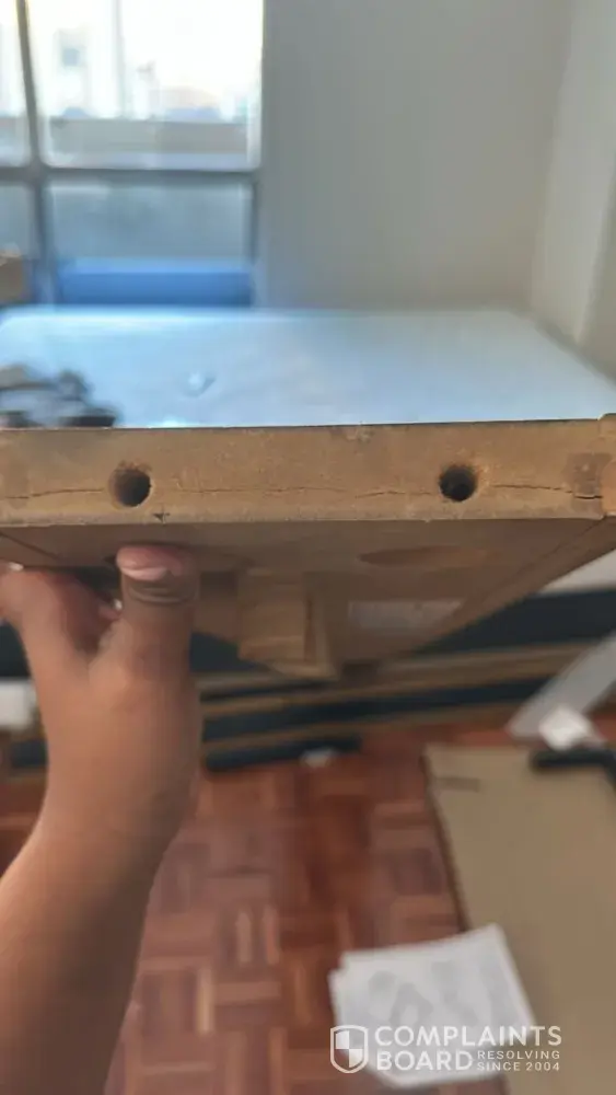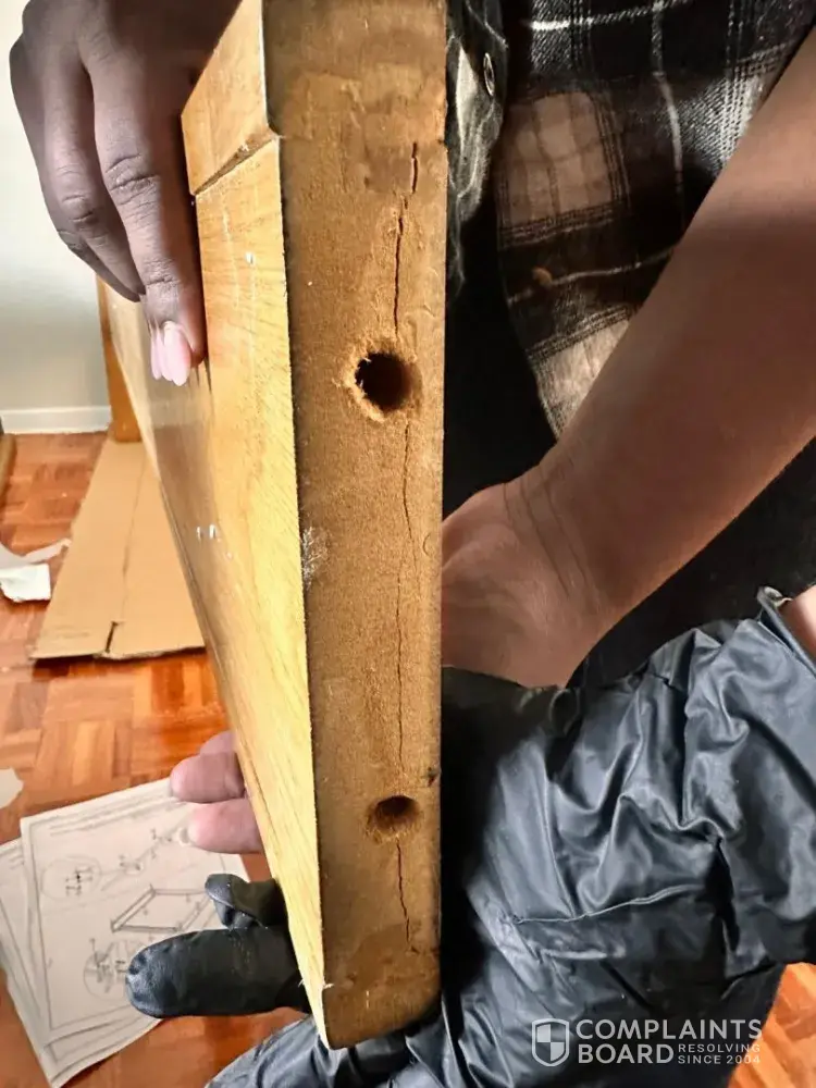 I hope this email finds you well. I recently purchased a wooden oak bed frame from your store. Upon inspection, my friends and l discovered a crack in one of the long panels, a huge amount of wood dust was coming out from the holes. the holes from the long panels appeared to be big. Overall, the bed frame appears to have been used for 5 months or more prior to my purchase, as it was dusty and lacked the fresh wood feel, and the corners show signs of wear and tear with stains indicating trapped dust.