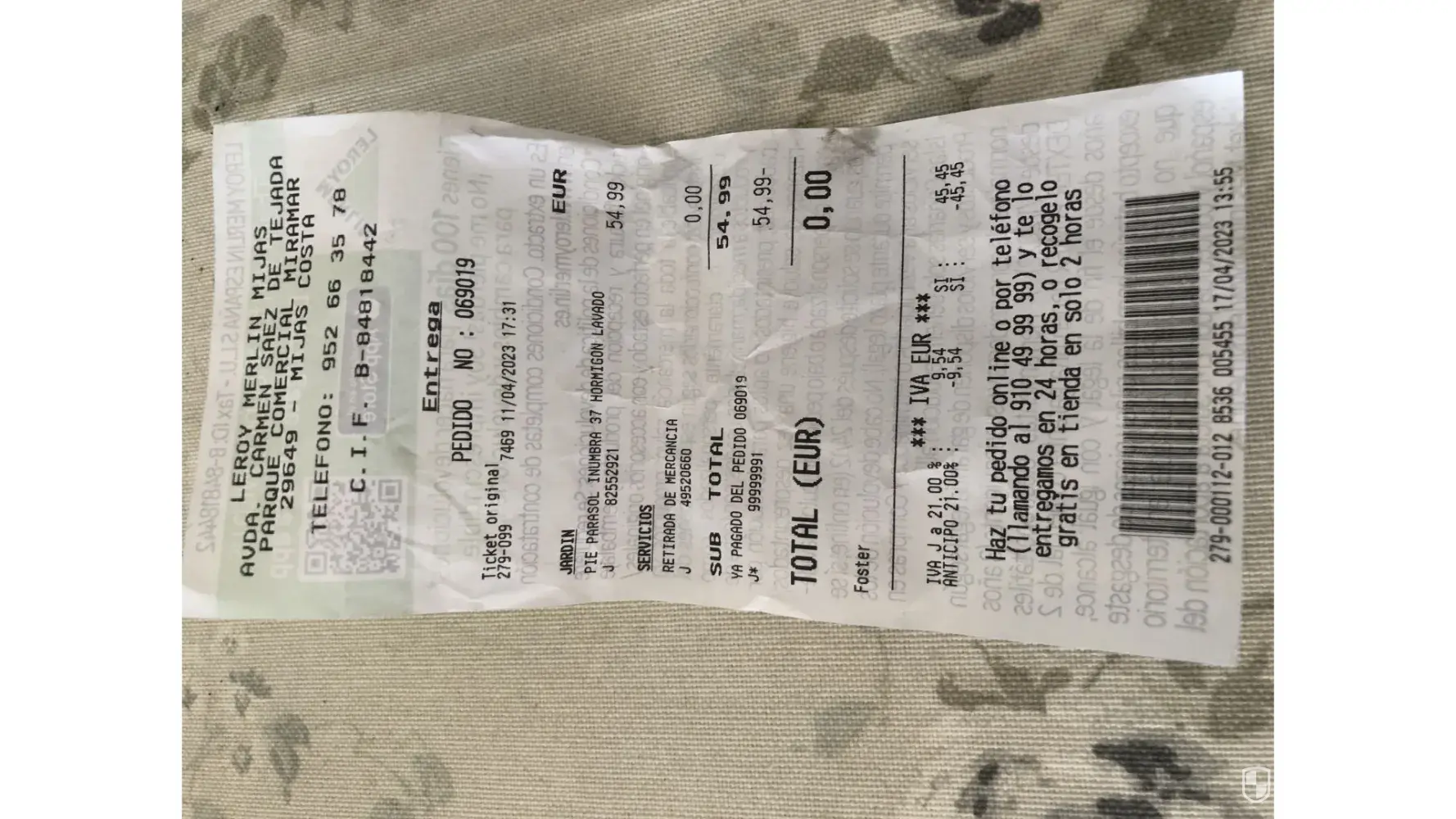 On the 11/04/2023 i purchased a umbrella stand online , I then collected it from Leroy Merlin Mijas .