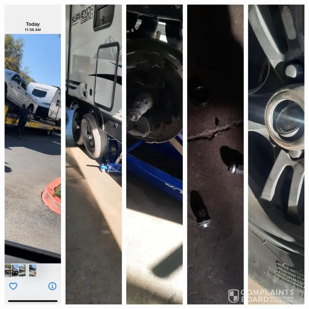 Once we arrived at the Brentwood location at 5:40pm, (on the flat bed of a diesel car carrier) it was evident that our RV wheels were a complete mess. Parts were falling off as it was backed into the bay. Please see the photos below. I have many more if needed.