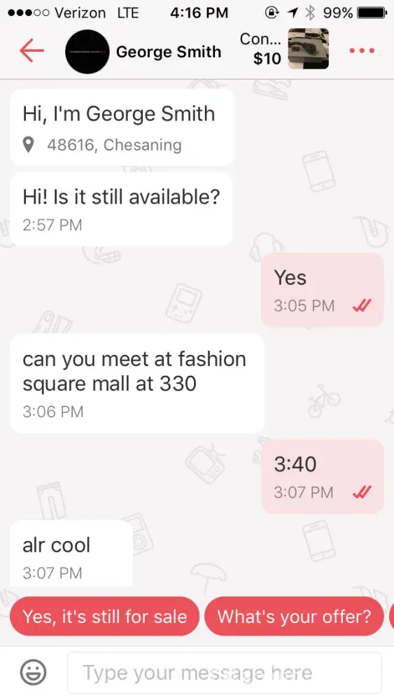 Spend several days planning out a time to meet with a guy to buy some shelves that I desperately need... Day of meet arrives and he was supposed to send me contact info and an address. Go into messages because my phone chimes to let me know he sent a message. The specific chat is not showing up. It was right in the notifications on my phone and everything, but I cannot under any circumstance get the chat to show up in Letgo. In a few hours, the guy will consider me a no-show and probably block me because Letgo has POS messaging. I've been using this app for several years now, but lately their messages are getting worse.