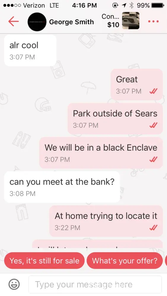 I want to report a suspicious and potentially dangerous encounter that I experienced with a Letgo customer. A person named George Smith contacted me today 11/20/18 regarding buying a product I was selling. He wanted to meet at a bank near our local mall in the mid afternoon. That sounded safe enough for me. When I asked what he was driving he told me a Grand Prix. He then switched and said he was in a white GMAC truck which we spotted in the parking lot. As we approached the woman in the GMAC truck she thought that we were "George Smith". I wasn't alarmed at first because I thought he simply was buying two products and that he was meeting us both at the same time. Then the woman told us that George told her that he would be in a black Enclave which is what we told him we were driving. He managed to get us both there then told us to approach his car. It was very concerning to both the other woman and us (me and my husband). We left promptly and told him that there was a mix up and that we were not interested. He then said that he was there in a black Enclave. I told him that I was submitting a report and he was concerned that it was to the police.