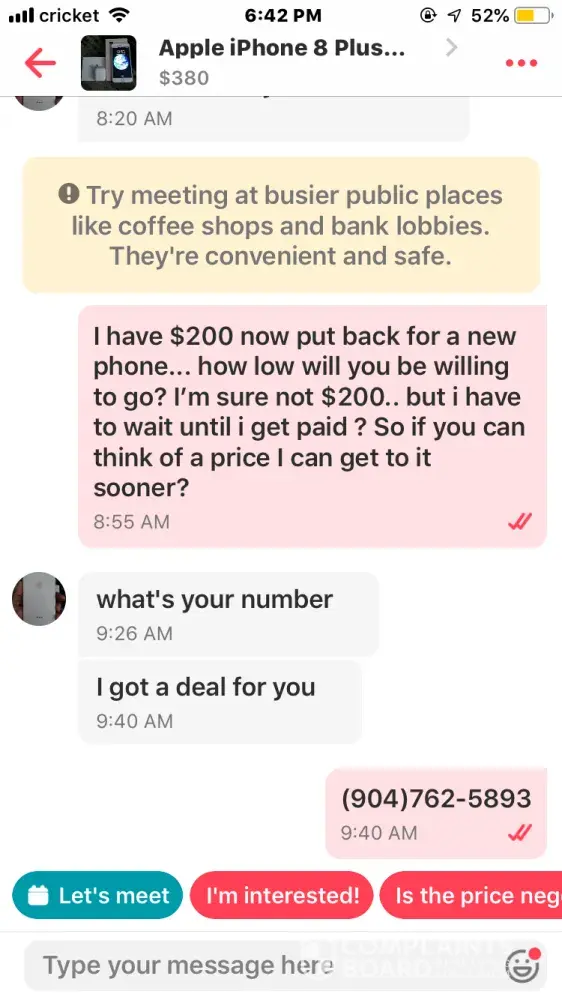 So i was shopping on the letgo app acouple of days ago looking for a new phone. I ran up this this guy named "eric brown" so we were chatting about the phone and the details of shipping so he told methat it will arrive today at December 3 at 1 oclock and i didnt get no package so i try texting him on imessage and on letgo but he blocked me on both apps so i think this guy has been scammin many people and he scammed me like wow he was very good and it was my first time shopping on letgo so i dont know how it really works and im just tryna get my money back.. thank you