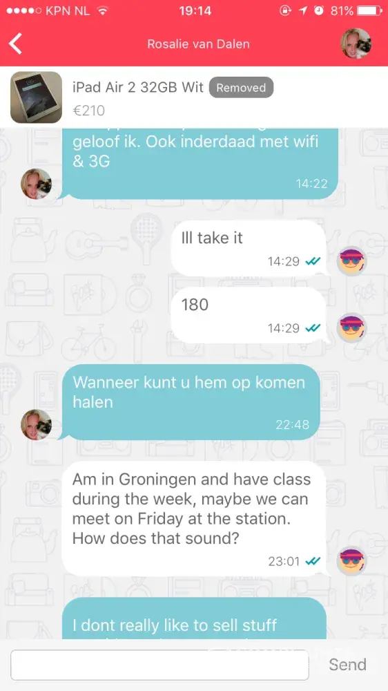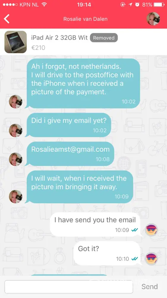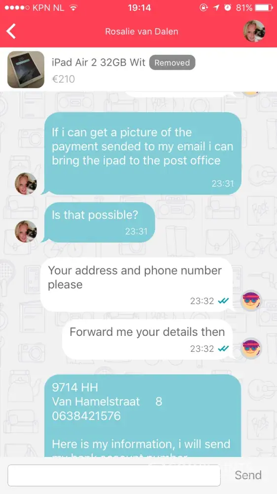 I was scammed by a ms Rosalie van Dalen. She was selling an iPad Air 2 and an iPhone I put in an offer. Emese both agreed to it and she asked me to transfer the money into her account which I did and the last I heard from her she was on her way to send the iPad my way. Ever since she removed the add, her phone is on voicemail and never responds to emails or request for payment. This was on the 18th of September 2017. I went to the police station to file a complaint and was advised to send this complaint.