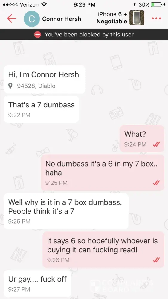 hello i posted an iphone for sale and had a really rude person call me a [censored] and gay and an idiot because he could properly read the product heading that said iphone 6 can you guys get rid of his review on my profile he bashed me for no reason then blocked me i can show you all that chat. As you'll see in the pictures below it was completely unprovoked and uncalled for in the manor he addressed me. I really hope you can get users like him off this site and get the false report he filed off my reviews