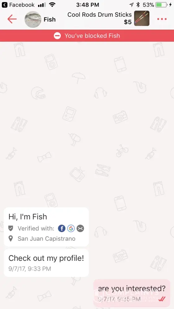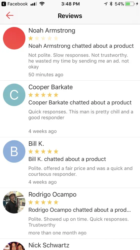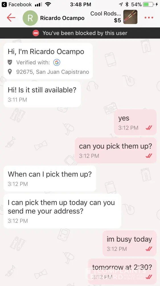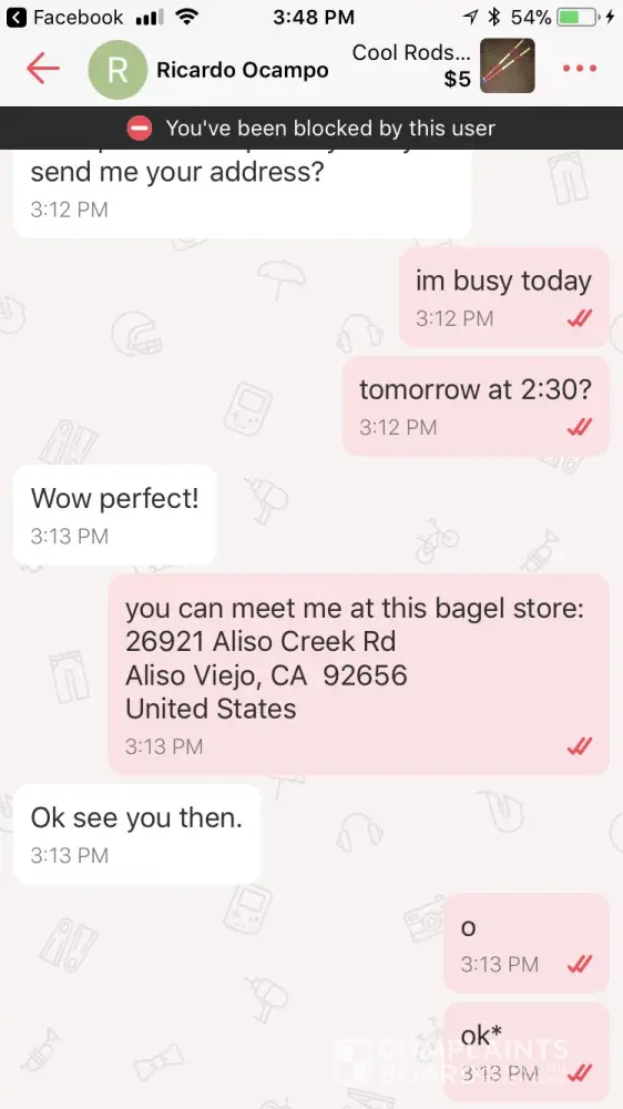 A user calld fish left a message saying to check out his page, which is advertising without paying and wasting my time. i said are you interested and got no reply so i left a review saying he was advertising and wastunv my time and then i blocked him. then he made a fake account under the name ricardo and said he was interested and tried to get my adress. We made plans and he lefy a phony review saying “got you†i really appreciate any efforts to make sure the review is taken down. thanks -Noah Armstrong