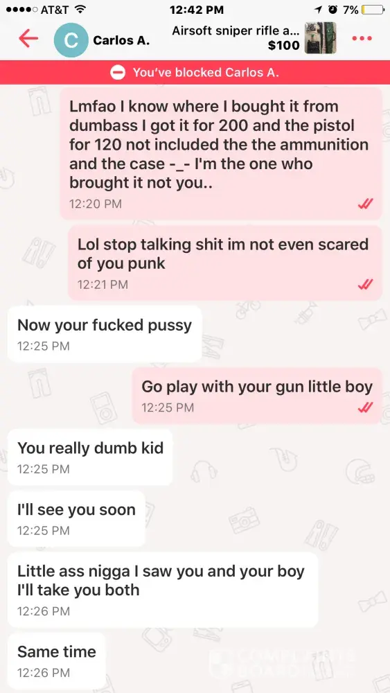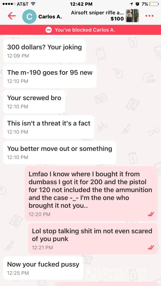 I sold someone something on letgo it looks like he didn't read the description that one of the items doesn't work and requires a spring in order to work.. he gave me a bad review saying I ripped him off so I wrote a review back defending myself.. now he has been messaging me threatening me that he knows where I live and he does know where I live because I gave him my address to pick up the item which was a bad idea not knowing that he was a crazy person. Now he is threatening me and the people in my household. I need to help to get the persons information to report him to the police.. please email me back as soon as possible amir.[protected]@gmail.com