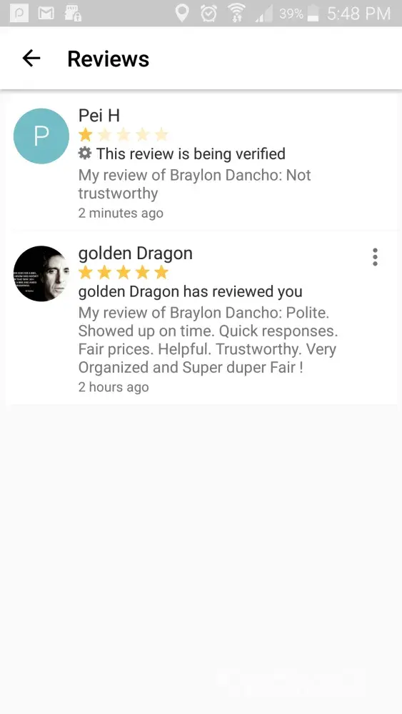 I believe something is really wrong with letgo.com's peer review system. reviews of others should be anonymous, otherwise purpose of genuine review of a seller/buyers' profile is defeated. - how the star of a seller/buyers profile is rated will not be based on truth, but rather response of how the other party has rated you.
