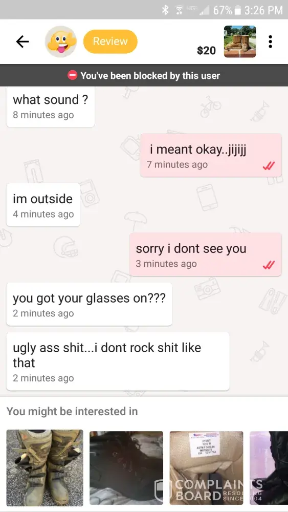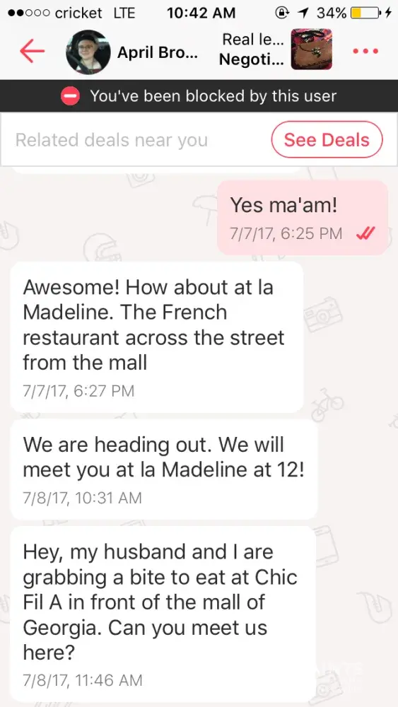 I was contacted about an item I had posted, they showed interest in the item so when they ask for my address I gave it to them because I had just had a yard sale and was trying to get rid of everything a few minutes later they responded saying that they were outside but when I went out side to check they were not there so I told them I did not see them and then they responded in a very disrespectful manner. Then they proceed to block me