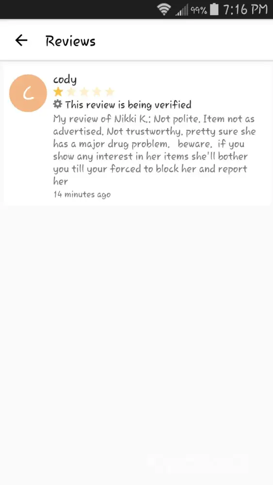 By that point he had already reviewed me with one star, saying I was a major drug addict and that no one should buy from me because I would harass them until they were forced into buying or blocking me!