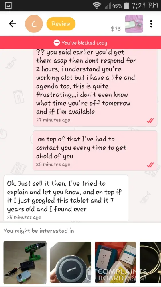 I am complaining because I purshased a iPhone 7 plus red from the user amber marie which was technically supposed to come today and I got scammed by her for $150. I either want my money back or the phone. I also don't understand why let go lets people like this on their app. I worked day and night for that money and the fact that I have to get scammed like that is very messed up. All I want is my mine back or I would appreciate the phone
