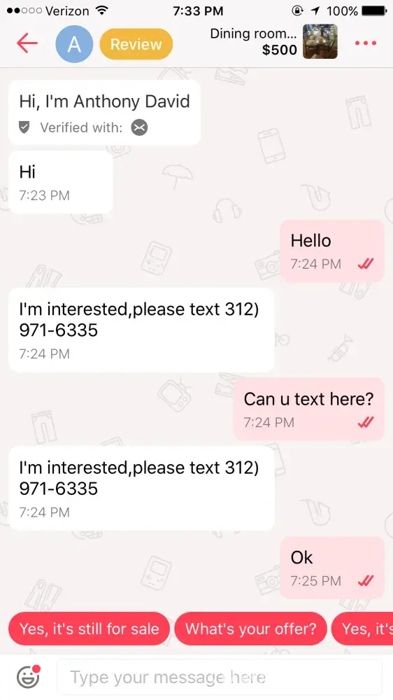 I was selling a vanity light fixture and a man or woman wanted my number to talk or text. So I gave it to him and he is trying to get people to give their names numbers and address. He is saying he will have his secretary will send a cashiers check or money order plus $50.00 to hold the item for him. I'm sure he is trying to scam people on the site and new young users may think that's how it's supposed to be done. The number he texted me from is [protected]. I don't usually complain but a person like that dicusses me. He trying to take advantage of the new young users or the old users that don't know not to give out that kind of info. That's all I'm done complaining. He's trash and should not be allowed in your site