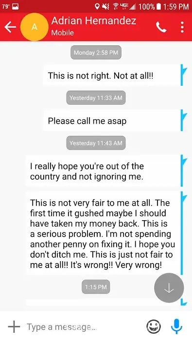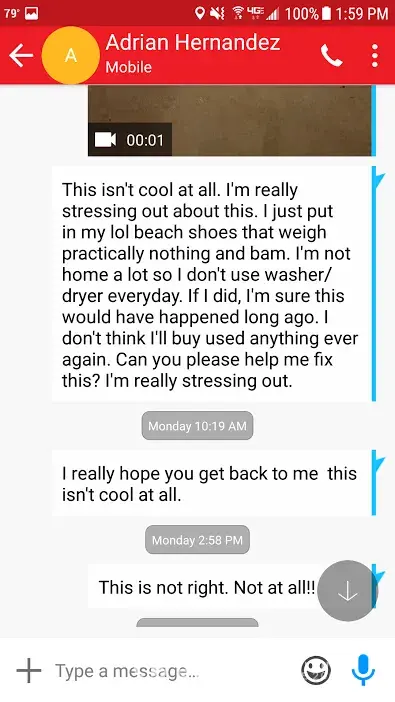 I purchased a washing machine from Adrian Hernandez (sorry I cannot find his client id). The first time I used the washer, water and soap gushed everywhere. My brother, my boyfriend and I went onto youtube to try to figure out if it was an easy fix or not, but it wasn't their field of expertise. I had contacted Adrian immediately. I was so afraid he sold me a lemon. He was nice enough to come out and fix it. He said this kind of thing is what he goes to school for. He also said it was only 2 years old and this has never happened to him. So he did, which I found him to be a straight up guy by doing so, he came by and took a look at it and said it was the water pump. Now because he was nice by coming by and trying to make it right, I didn't even ask him to pay for the parts. I just did it. It cost me $70 for a new pump. I wasn't home when it came in but my mom let him in and he did install it for me. I was so happy to come home and do laundry. Now this is after 4 full washing machines of water and soap have gushed out onto my floors. Thank God its a patio laundry room. I had the dryer up on 4 gallons of paint cans to keep the water from getting the dryer wet and breaking too. But the washing machine wasn't fine. It gushed water everywhere again. Adrian once again came over to take a look to see what was the problem. He fixed it once again and what I thought was the last time. All seemed to be working well. I washed blankets just to do wash to make sure it didn't leak anymore. I am a flight attendant. I am gone for weeks at a time. I do not use this washing machine everyday. But 3 nights ago I saw water gushing out from under the washing machine once again. I spend $360 on the both, the washer and dryer. And an additional $70 on a part for a bum machine. Ive contacted him for the last 3 days and nights and he hasn't replied to me at all. I honestly thought he was a nice person. Unfortunately I deleted the texts between him and I about the machine. I had videos and pix and our text thread that was for quite some time as our schedules seemed to collide. I am going to go on youtube to see how to get those old texts back. I do have texts and a video that I sent him these last 3 days. He hasn't gotten back to me at all. I really didn't think he would do something like this. I told him I wish I just returned both items and gotten my money back the first time this machine gushed soapy water everywhere. I haven't heard back so Im reaching out to you. I want my money back. He can have his washer/dryer back. Its been nothing but problem after problem. Its not fair to me at all. It has been nothing but a headache and more stress that I do not need in my life.