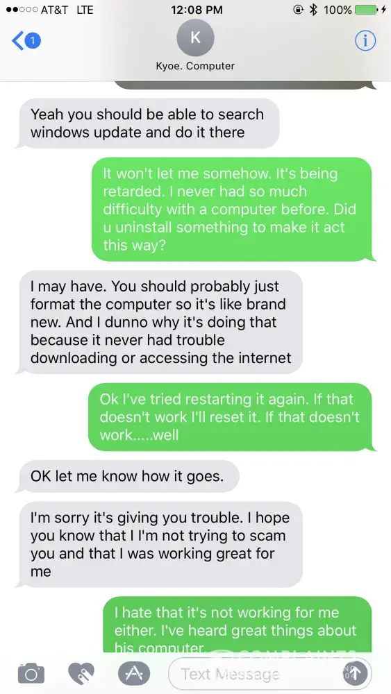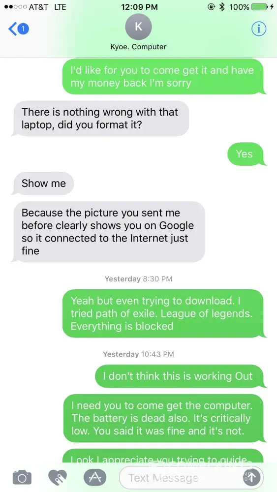 I got ripped out of 500 dollars from Kyle who sold me a computer that doesn't work and then artery is not working at all. I asked several times if it had battery issues and he assured me that it didn't. He won't answer me at all nor give me my money back. I've tried reaching him and trying to reason with him in any possible way. I even asked first if he would just show me how the computer would work for him because it wasn't working for me at all. I told him I was just looking for a good computer to do my photography business on and I've heard great things about this computer so he reassumed me he wasn't trying to scam me out of my money which he lied. He keeps selling items that don't work at all. Kyle Beckwith from Memphis TN. [protected]