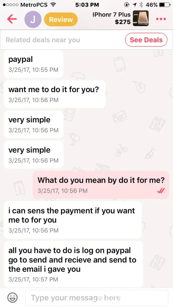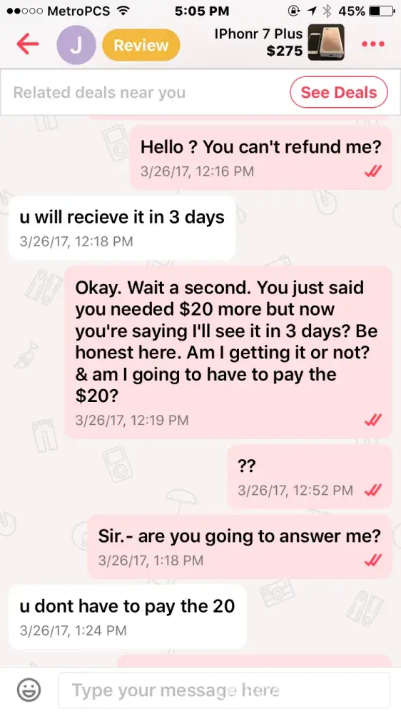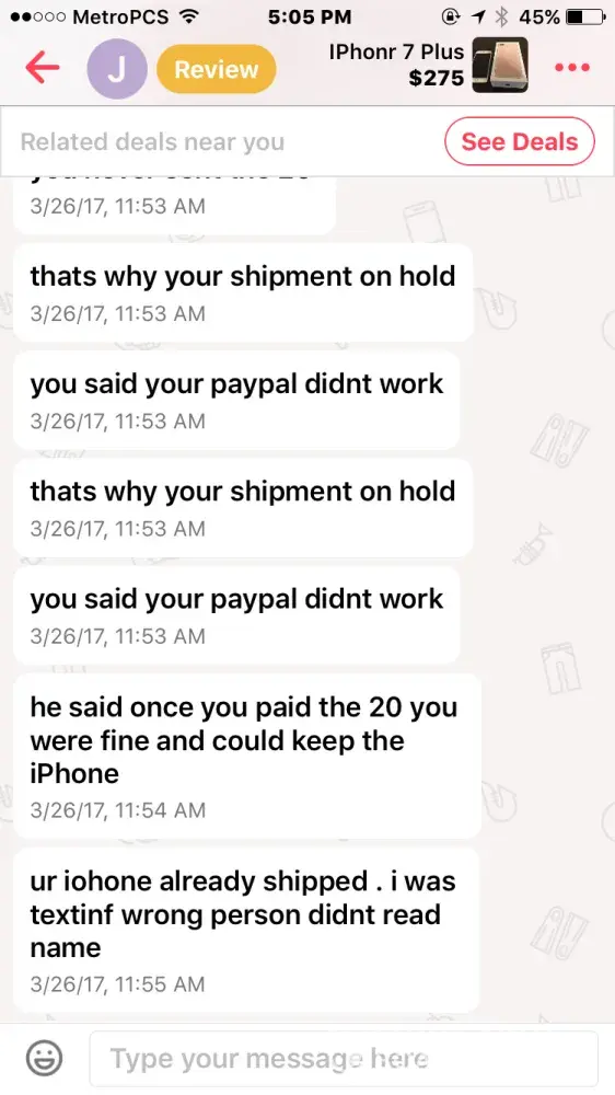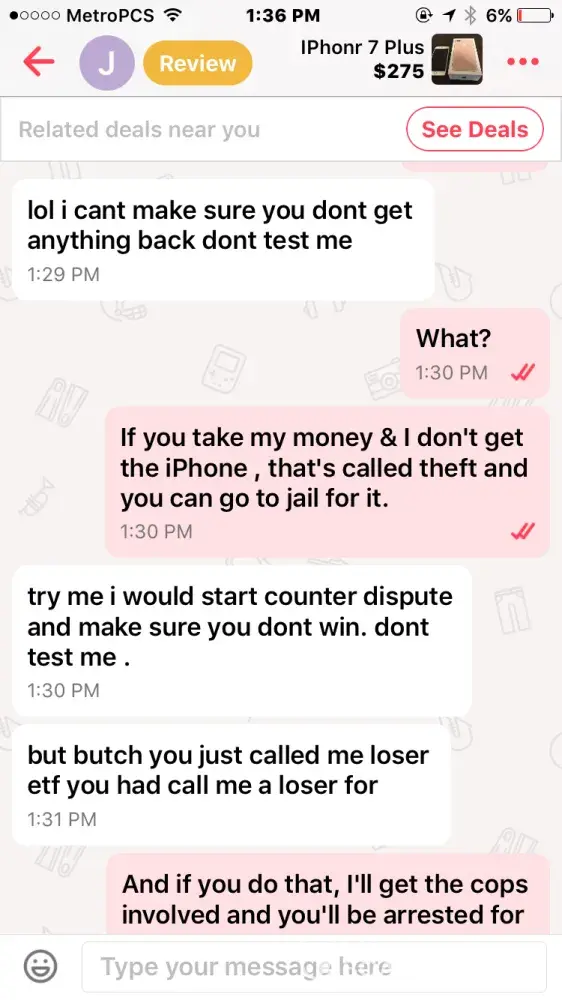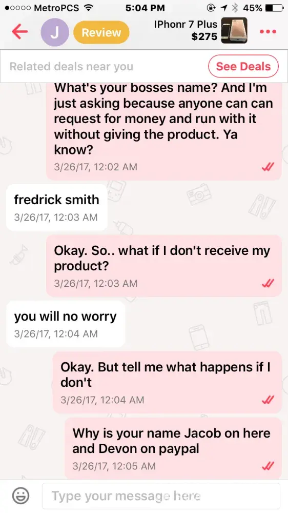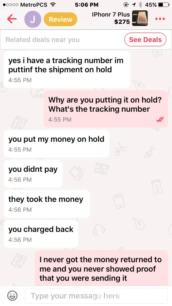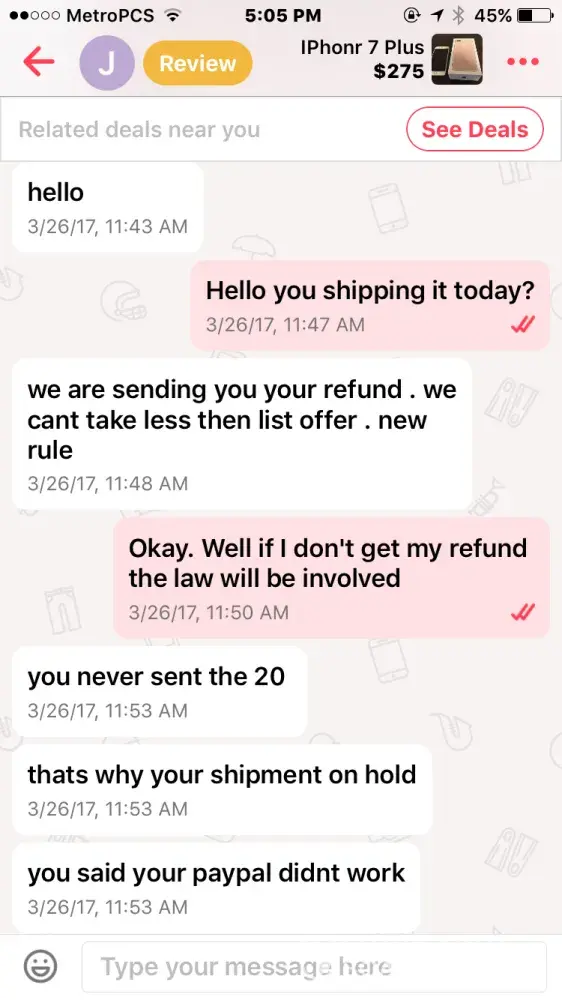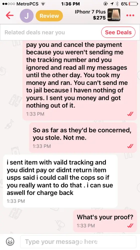 I bought an iPhone 7 off this guy named Jacob smith. He had me pay through PayPal so me being new to PayPal and letgo, I did. Well after a few days he wasn't responding to my messages but read them and claims other people from the "company" must have been reading them, so I thought I was being scammed & requested PayPal to investigate. It took the money I sent him away from him and he told me that if I didn't the money back he wasn't going to give me the iPhone & PayPal never took the money from him as I found out when I called today.