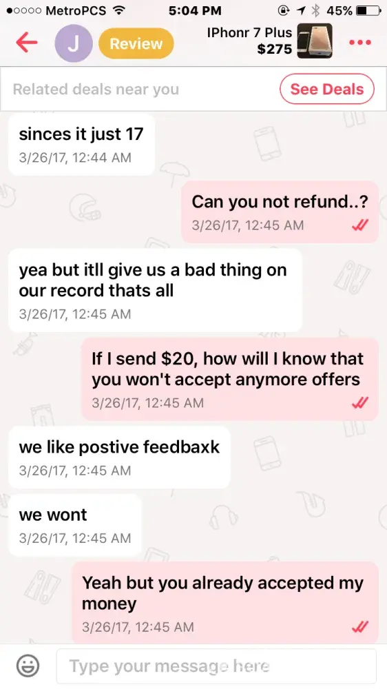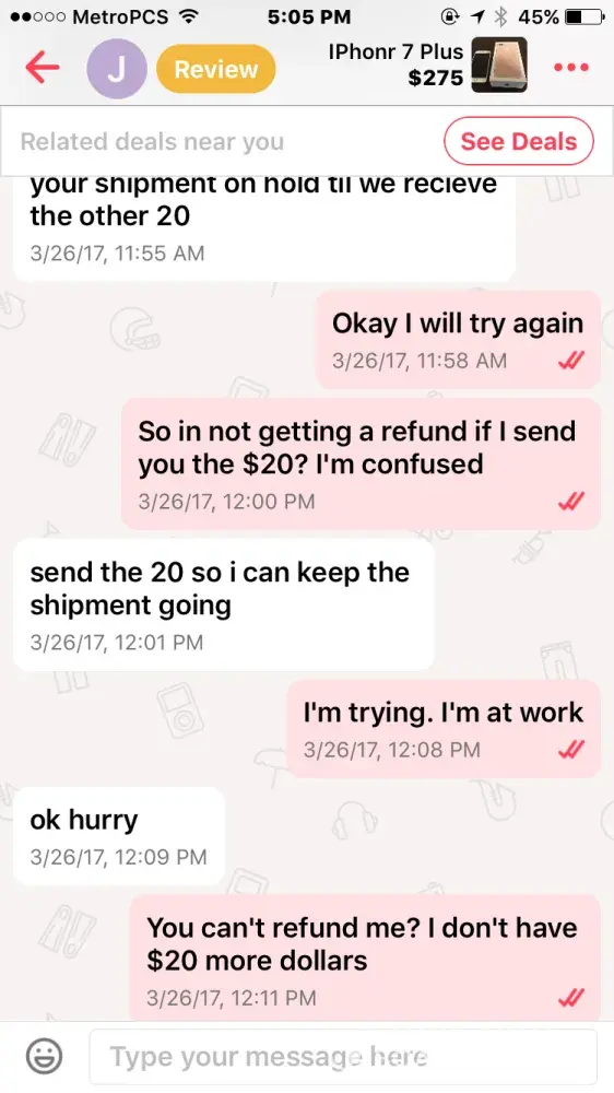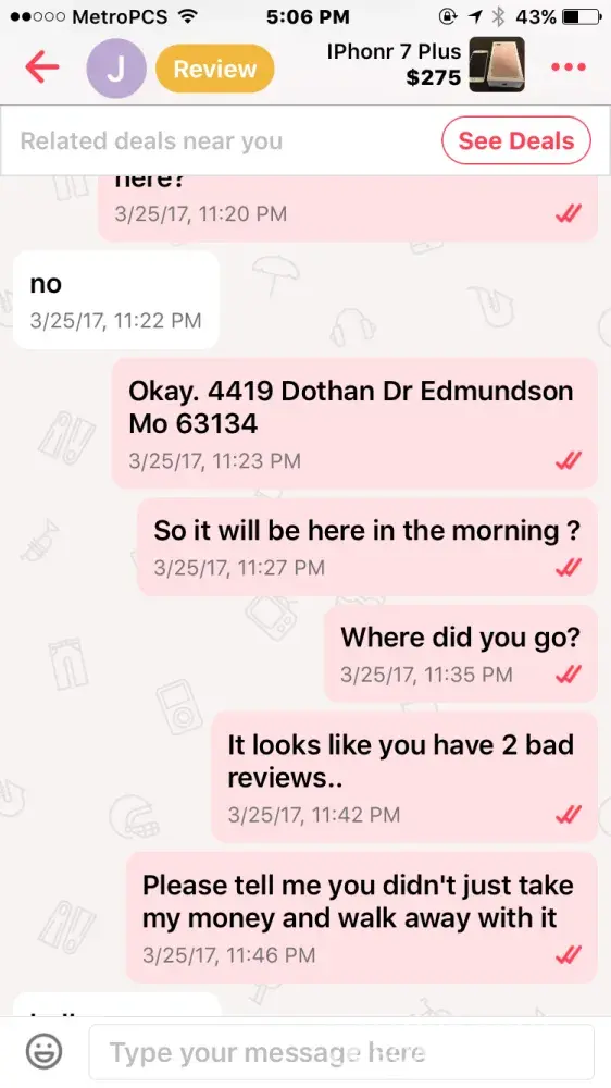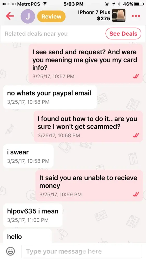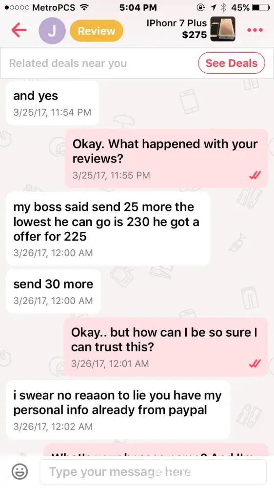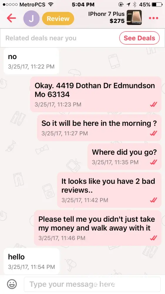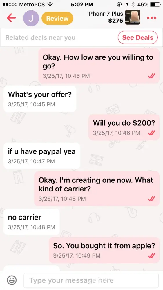 I bought an iPhone 7 off this guy named Jacob smith. He had me pay through PayPal so me being new to PayPal and letgo, I did. Well after a few days he wasn't responding to my messages but read them and claims other people from the "company" must have been reading them, so I thought I was being scammed & requested PayPal to investigate. It took the money I sent him away from him and he told me that if I didn't the money back he wasn't going to give me the iPhone & PayPal never took the money from him as I found out when I called today.