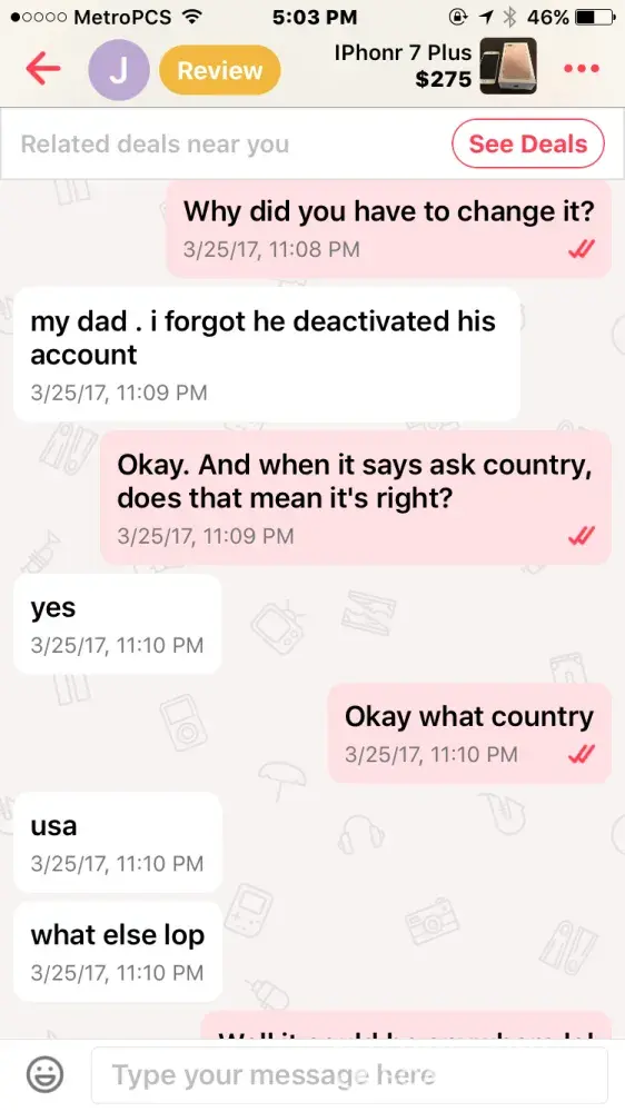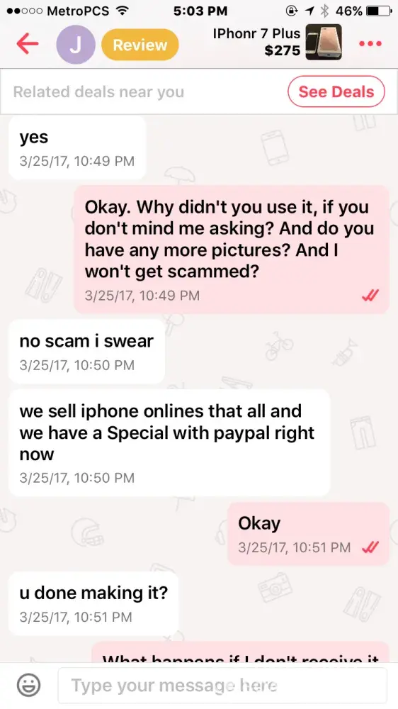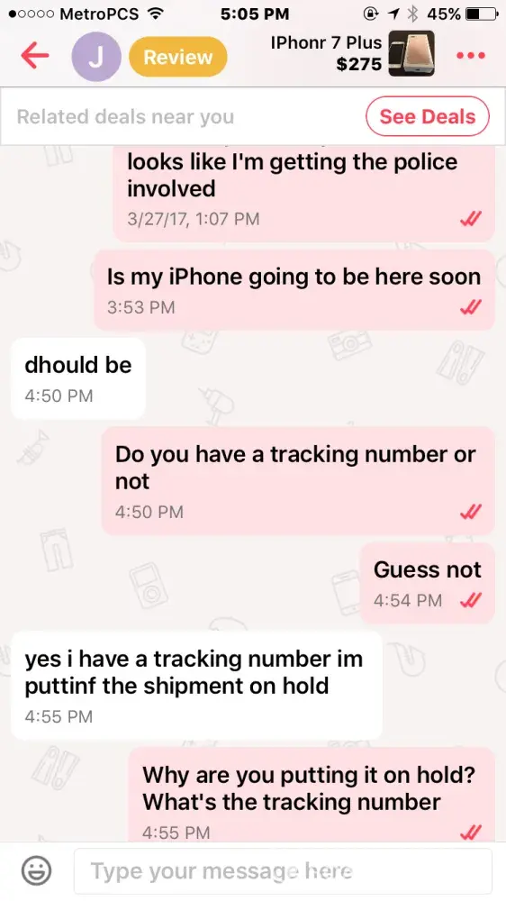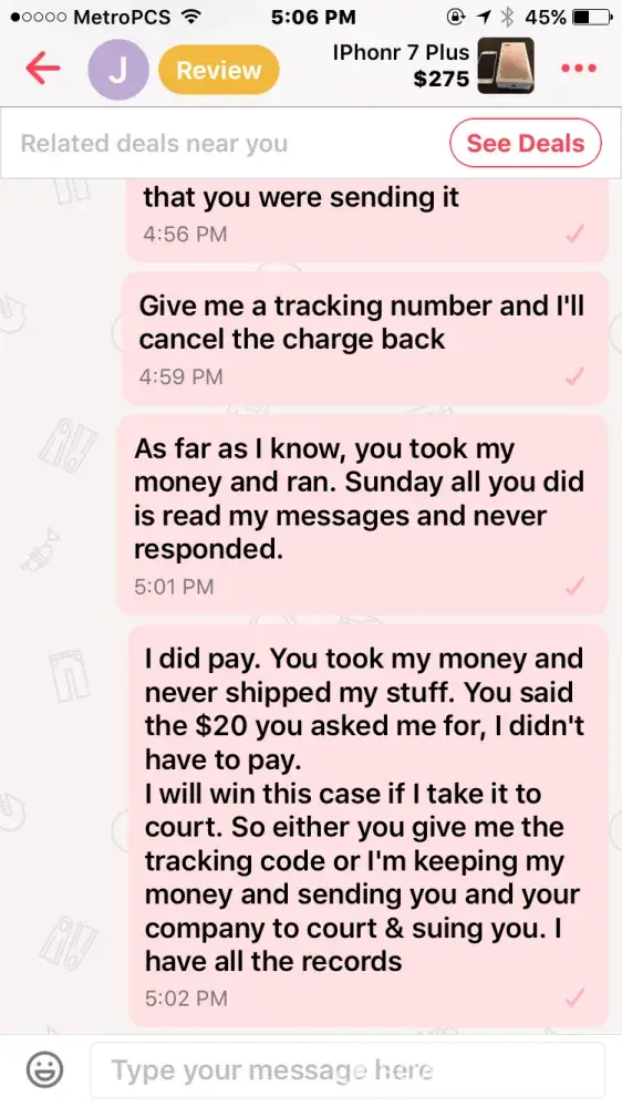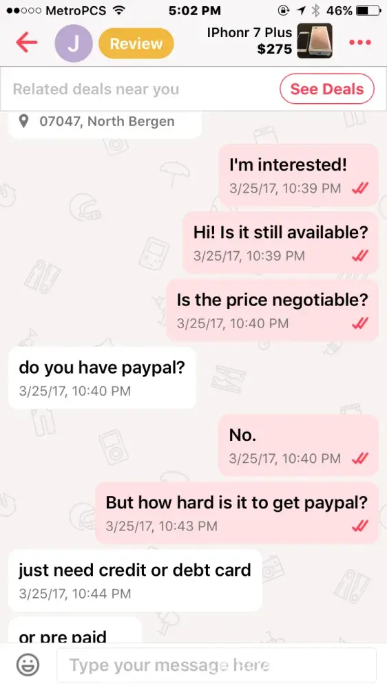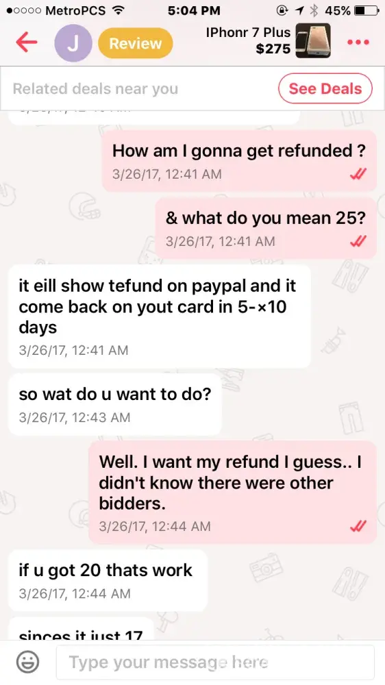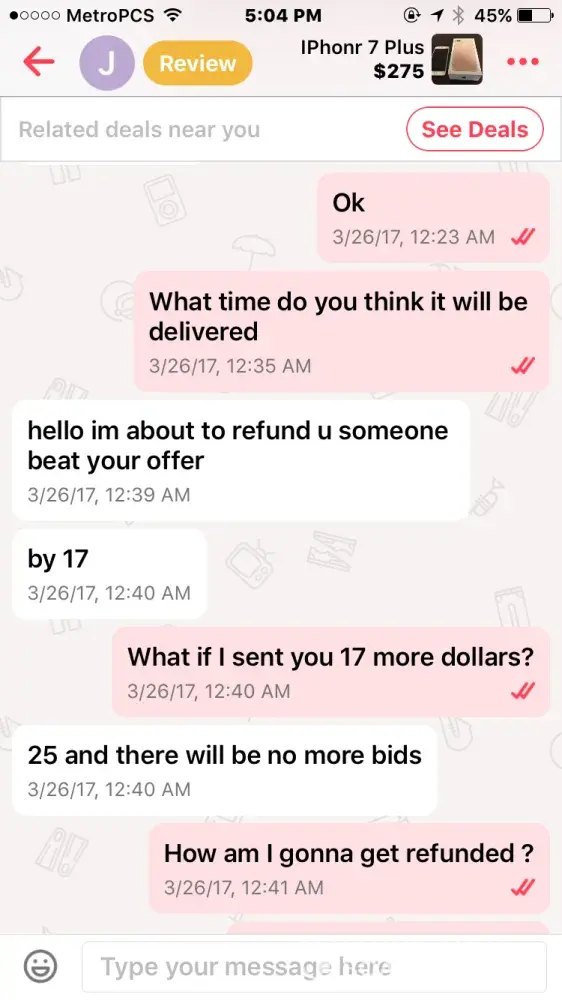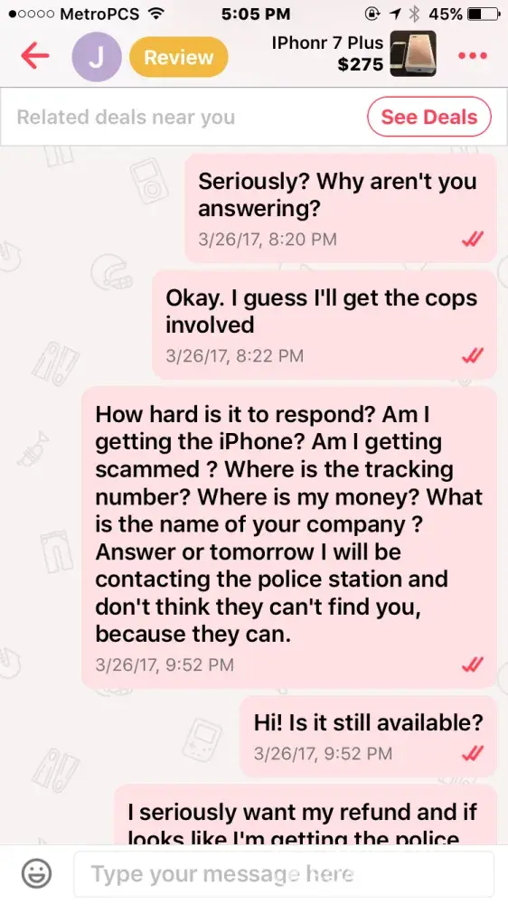 I bought an iPhone 7 off this guy named Jacob smith. He had me pay through PayPal so me being new to PayPal and letgo, I did. Well after a few days he wasn't responding to my messages but read them and claims other people from the "company" must have been reading them, so I thought I was being scammed & requested PayPal to investigate. It took the money I sent him away from him and he told me that if I didn't the money back he wasn't going to give me the iPhone & PayPal never took the money from him as I found out when I called today.