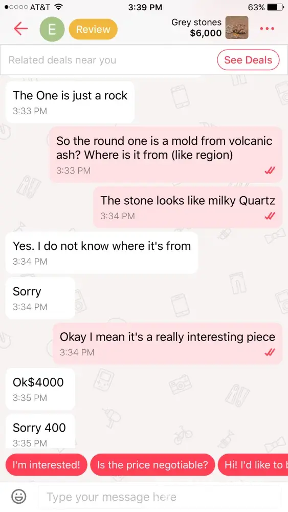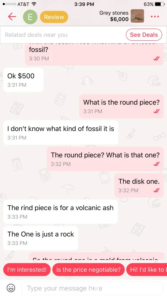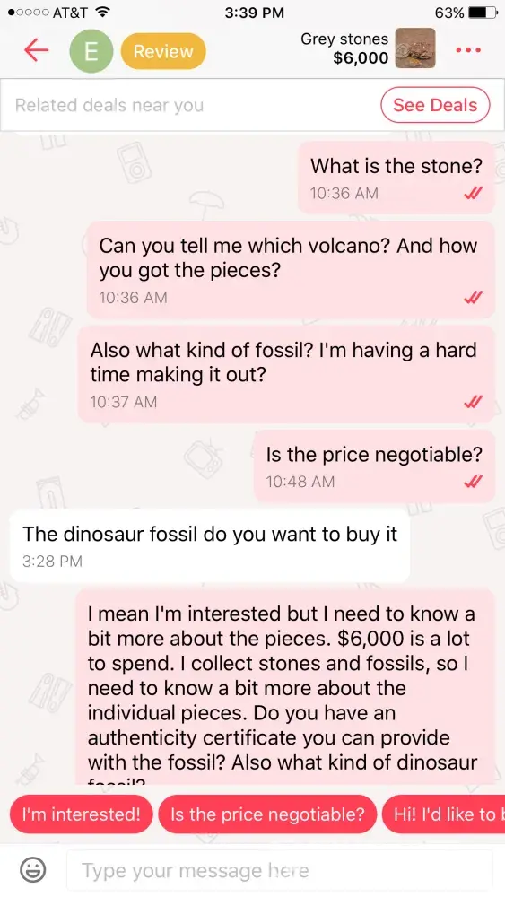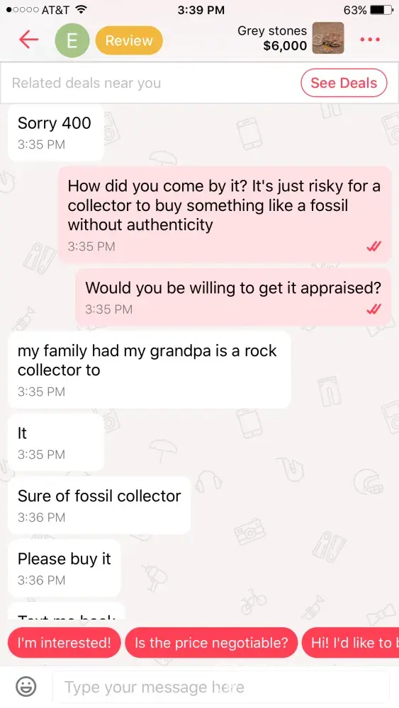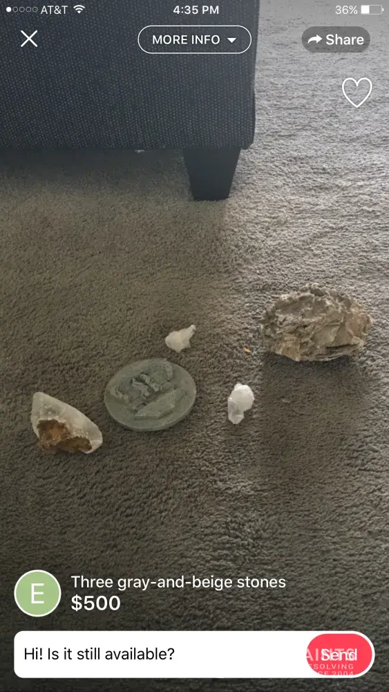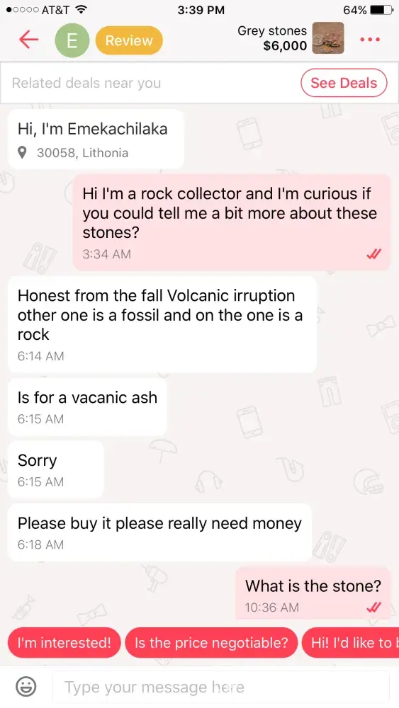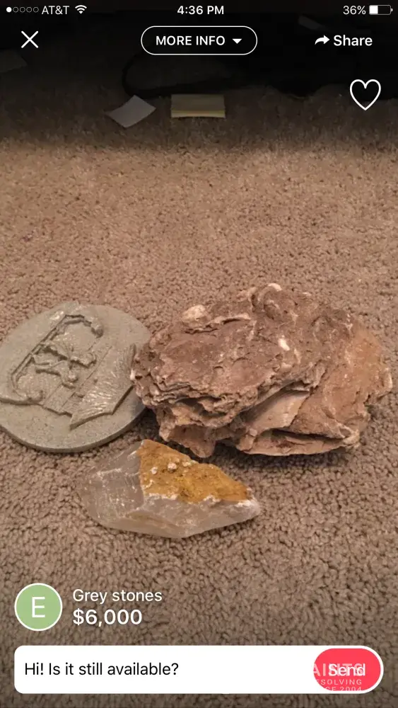 I am a rock and mineral collector and I saw an ad for "gray stones" along with a $6000 price tag so I was curious and I clicked on them and it looked like generic quarts along with a garden rock so I asked the seller to elaborate on the stones and minerals and she literally told me that they were gray rocks and the one was a "dinosaur fossil." 🙄 Emekachilaka Is the seller in Atlanta. I asked for an authentication for the dinosaur fossil and she had no idea what I meant. After about 10 minutes of conversation she change the price from $6000 down to 500 then 400 then 200 then finally $40 ! It is not OK to have this sort of scam on the site. She asked me for money about 10 times and told me to just please buy it because she needed the money and it was pandering to its worst this person needs to be taken off for good when I complained about her listing she relisted it somewhere else on the site.