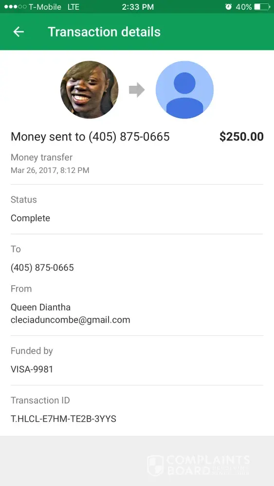 I purchased a iPhone 7plus from Britney Flynn for 250 she stated to me to send money through google wallet and the phone will be arriving to me by Wednesday. It's now Saturday an I have not received the phone or a message with any info I've tried contacting her but no response when I try To go back and send her a message I notice that she blocked me and I haven't received the phone or any info regarding the phone or a refund can you guys please help me get my money back