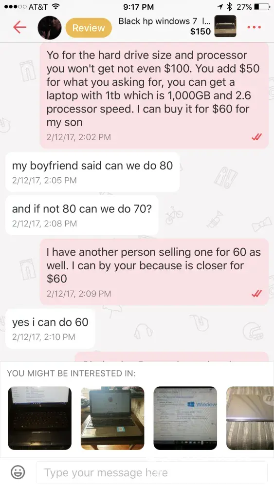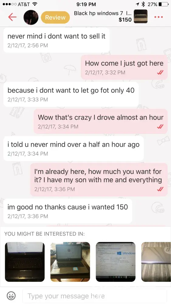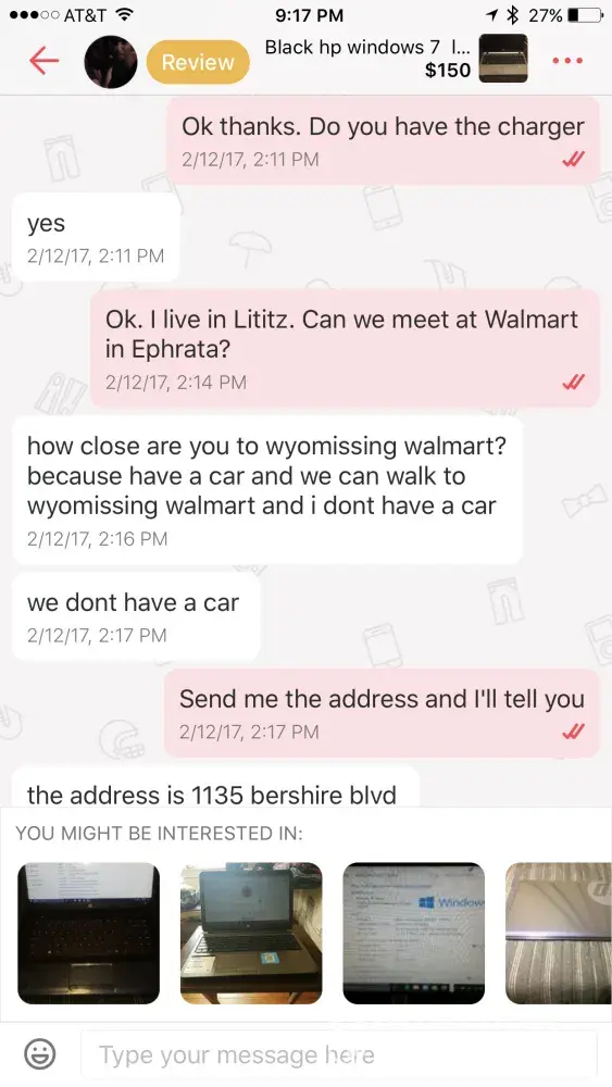 I contacted a girl name alysa Hall, she lives in Reading, PA. She was selling a laptop and we agree on the price, I said ok I'll buy. I ask her if she can meet me at Walmart located in Ephrata, pa and she said no because she doesn't have a car. I told her that would drive the 45 minutes distance from my house to another Walmart 2 minutes away from her home. When I was getting to Walmart to meet her, she said she won't sell the laptop if she won't get $150 for it after we agreed to a different price. I post it a review because I felt like if was a scam because that's what it seemed. I just noticed that she wrote a review on my page saying totally lies. I want you to ask for our conversation and see that she was wrong and I want her to delete that post. If you have any questions feel free to call me at([protected] my name is Alex, thank you.
