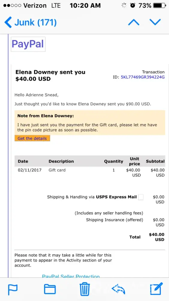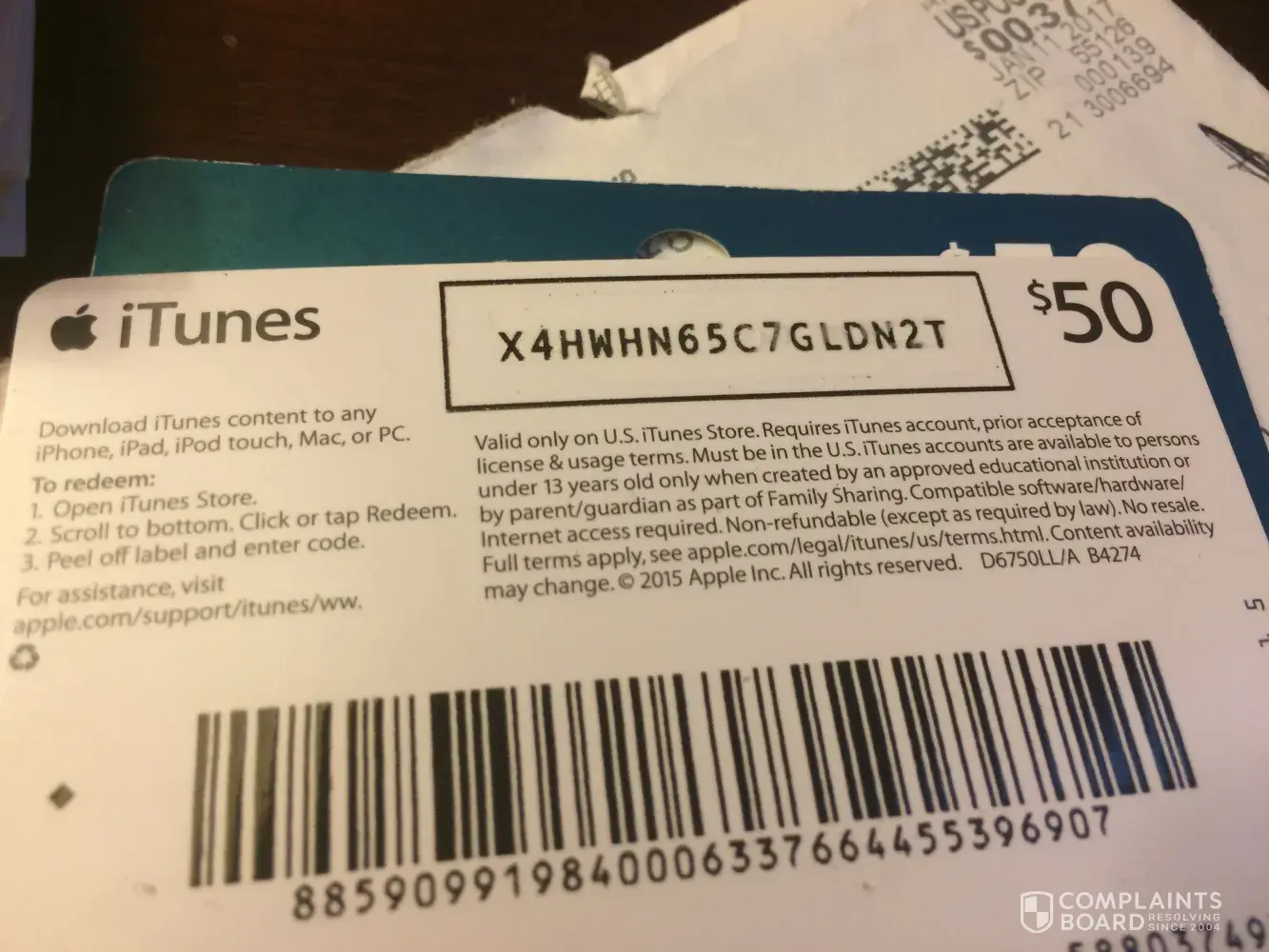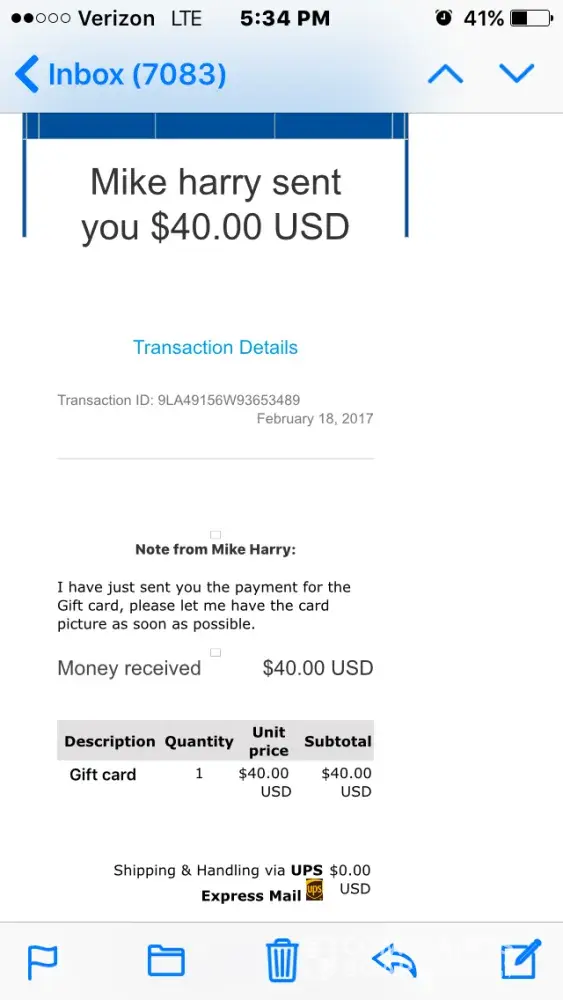 Two individuals bought an iTunes card for me for $40 they said they paid me a received an email with their "" receipts and they're tracking number but it never did show up in my accounts I called the number and the lady said it was probably a scam I will send the pictures to you