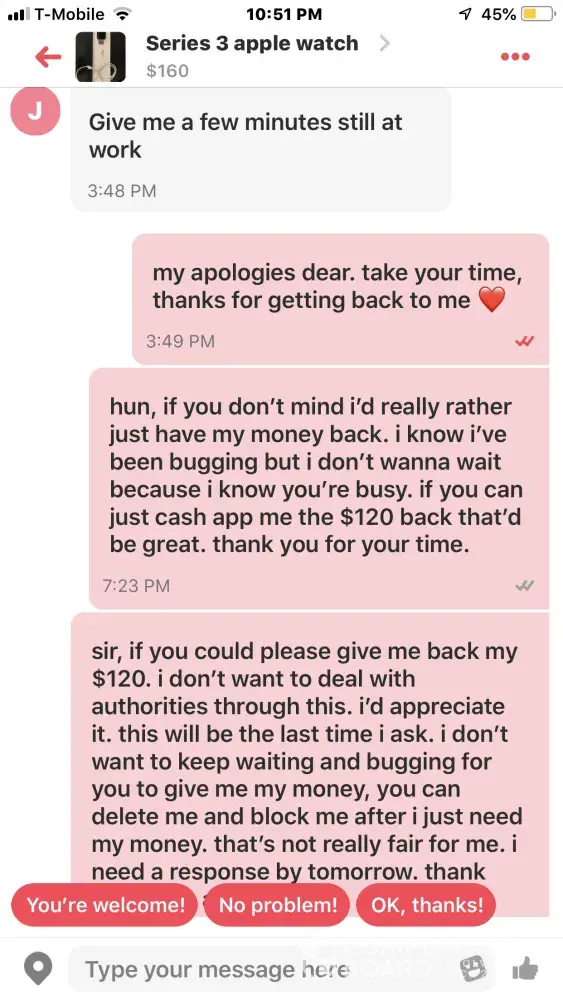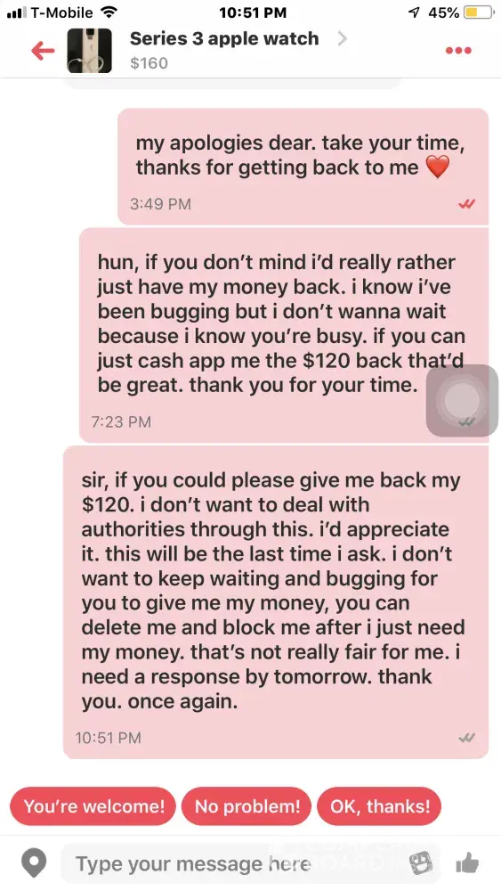 Hello, I'm worrying my butt off. I did something that was probably stupid and I need your guys help! I believe I was scammed out of $120 for Series 3 Apple Watch. I have screenshots of the conversation last night and he still hasn't got back to me. I feel as if he's avoiding me and won't block me because he doesn't want to make it suspicious. I don't know what to do, this sucks. I cash app him the money and stated he would send me a picture of the receipt in the morning and that he has "work" at seven so he would send it out before then. I'm really torn on what I should do. I don't know if I can get my money back now or if you guys can give me any possible idea on what I can do. I should've been smarter than this. When I first texted him he said he was trying to get rid of it for weeks when it's been up for 1month or longer. He had 70 hearts (favorites) and i'm not sure if he's done this to others. If you guys can get back to me. Please help! I even made a different account to see what he would say and he said it was still available even though I paid for it to be mine. I have screenshots and proof that I paid him. I have his cash app once again, and he just uploaded a picture of "him". He told me to wait around 3PM today because he was still at "work" but never got back to me. I'm highly upset, I know I should've waited to pay for it after I received the item, I was just so excited, please help me.