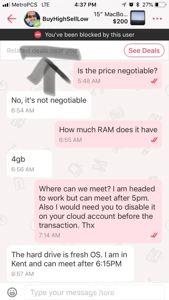 I'm new to Letgo. I downloaded the app a week ago. I thought it would be easier compared to sifting through scam after scam on Craigslist. I'm in the market for a good used car because my transmission has gone out in my Accord. I found a car I was interested in 2007 Lexus, I messaged the seller twice to let her know I was very interested. In the message I asked for the VIN of the vehicle for sale so that I could get a Carfax or Autocheck on the vehicle. I never received a response, but the vehicle was still posted on Letgo. After quite a few days I received a response stating that I was blocked by the seller. I didn't think it was unreasonable to ask for the VIN, I wouldn't buy a used car without doing everything possible I can do to give me a sense of security because of the possibility of being scammed. I wouldn't want to purchase a car and although it looks good externally find out later that it had been in a major accident and had 3 or more previous drivers. Sure I would have it checked by a knowledgeable mechanic, but I'd also like a car that has had only 1 - 2 owners. The Accord I have was purchased from Craigslist. It had 110k miles on it when I bought it. I'v driven it until now. It has 264k miles on it. It was a great car and still is, starts up no problem, no CEL, but unfortunately the transmission is shot now. Anyone here have a guess as to why the seller blocked me? I'm clueless!