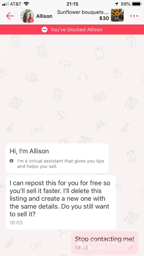 Every single day I get super annoying notifications from a "letgo assistant" Allison asking to repost my listings. This is either a robot, scam or spam. It needs to stop. I am about to delete the app.
