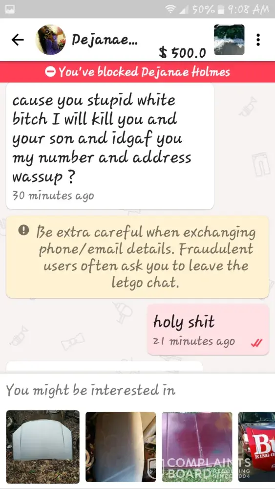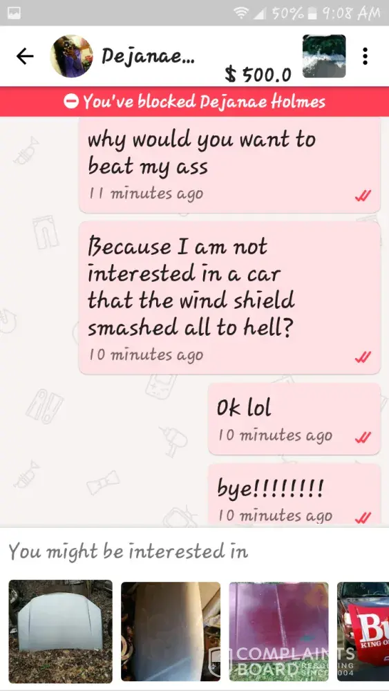 I wasn't interested in a car any long because I noticed the wind shield smashed and she got defensive and threatened to kill my family I am afraid for our safety. I just thought that saying I wasn't interested she would move on.. there is a police report as well because I frlear for her child safety too