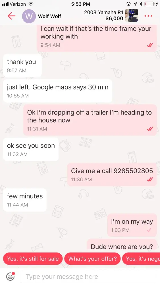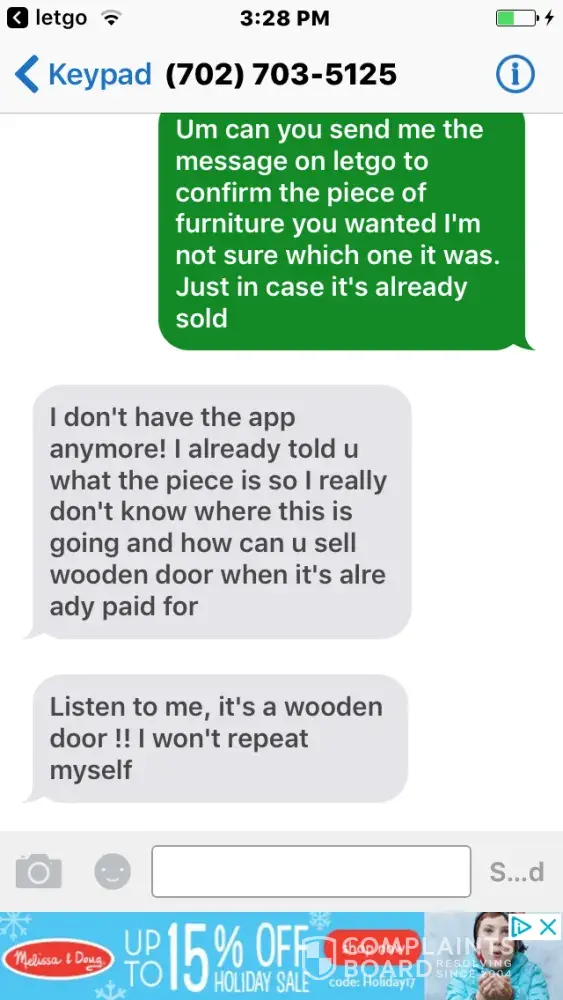 Ever heard of a "pocket dial" or text? Ever start to nod off with your phone in your hand while in an app, waking up to realize you had touched the screen accidentally, one or many times, in a conversation or not? Looks like you're using the desktop/computer version of Letgo, but have you ever had a smart phone with a touchscreen so cracked that it began to have a mind of it's own, making "ghost-touches" very rapidly and randomly without any way to control the chaotic activity except to hold the power off button until it shuts down? Can imagine several scenarios where a person might accidentally send one-touch Letgo template messages/responses repeatedly, and in excess, like seen in your situation. I highly doubt it was done deliberately. Don't sweat it man, and maybe think the situation through, even briefly, before interpreting it as something it's likely not, and then becoming personally offended by it and blowing the incident out of proportion to the point where you are becoming emotionally effected and then wasting your own and other people's time/energy by broadcasting your insignificant non-issue to the entire world on a public forum meant for resolution of serious and worthwhile complaints and grievances, often with significant financial loss and impact on their entire families.