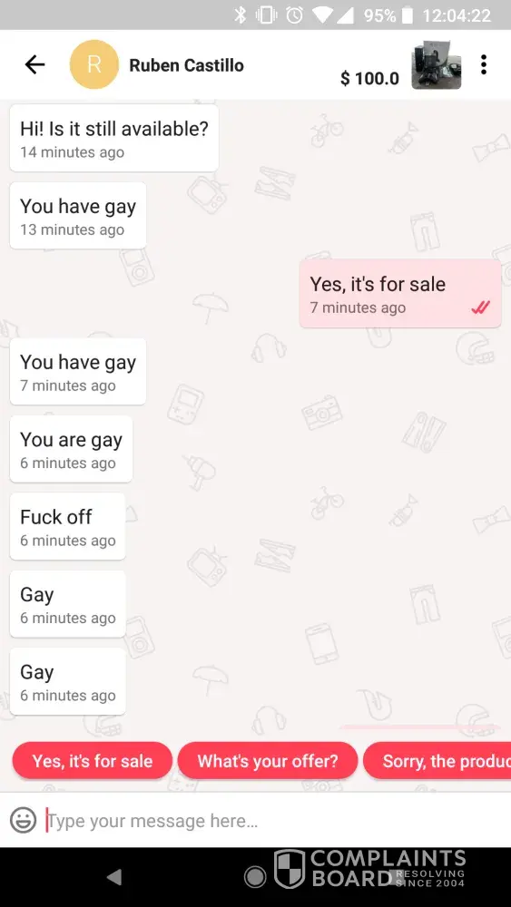 Are you seriously offended by this, to the point of escalating it to a public consumer complaints forum? Sounds to me like someone didn't take their meds, having an episode...or someone, taking too many "meds", having a similar random outburst of obscenities, in an inappropriate setting & context undoubtedly. Doesn't sound like someone "targeting" you, whether you are or aren't "gay". It wasn't mentioned that you know this person, or that therew was any provocation. So, I don't think the offense here warrants the type and magnitude of response, from you. The part of your complaint with real significance, however, is the unavailability, unresponsiveness, and non-transparency combined with questionable unilateral decisionmaking of Letgo support team - a problem shared by a great majority of heavily used app-based "tech" companies, really.
