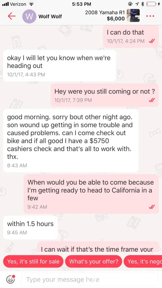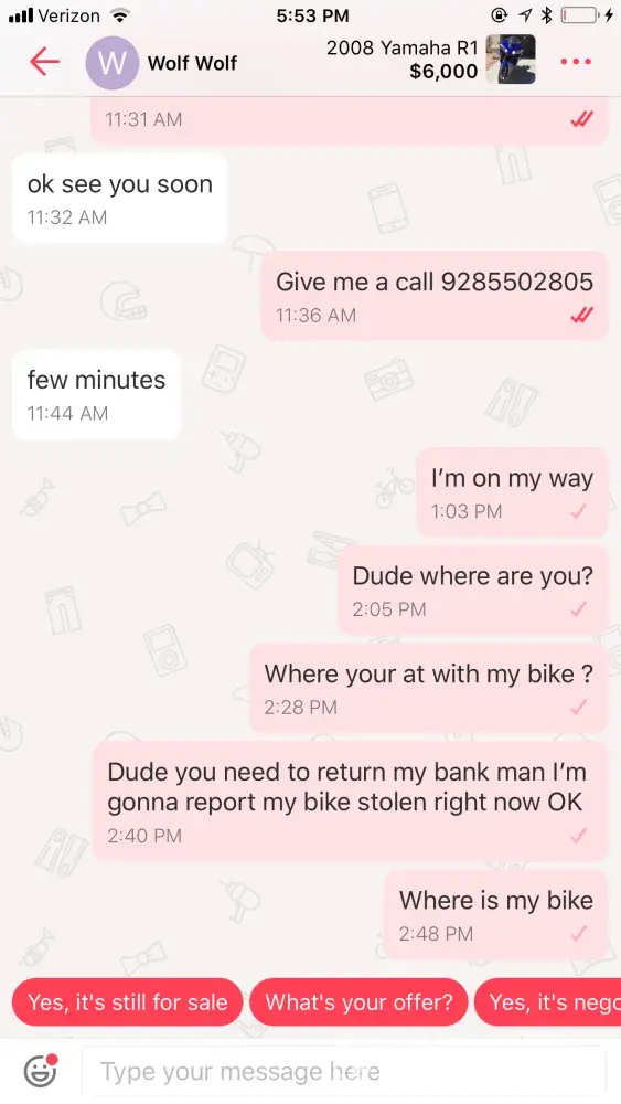 My motorcycle was stolen by a user from your site call wolf wolf out of Phoenix Arizona on October 3 2017 we went for a test ride and never returned. I need your help to locate this guy please. My name is Ryan jenkins and my number is9285502805