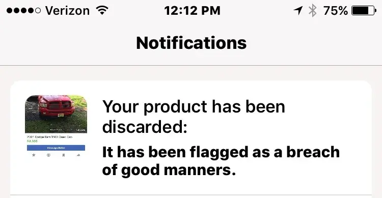I was sent a" your product has been discard as a breach of good manners" notice.